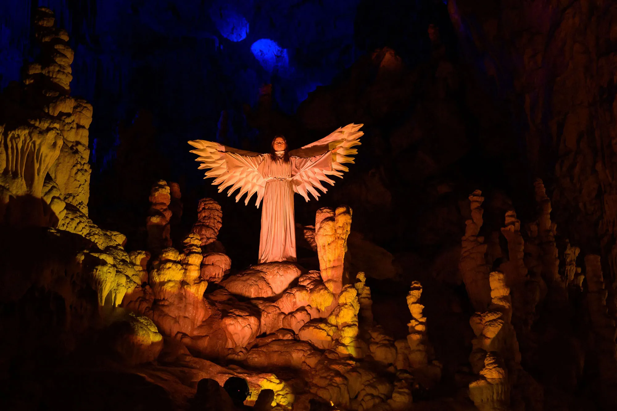 An actress dressed as an angel performs live nativity scene at Postojna Cave in Postojna, on December 22, 2022. (Photo by Jure Makovec/AFP Photo)