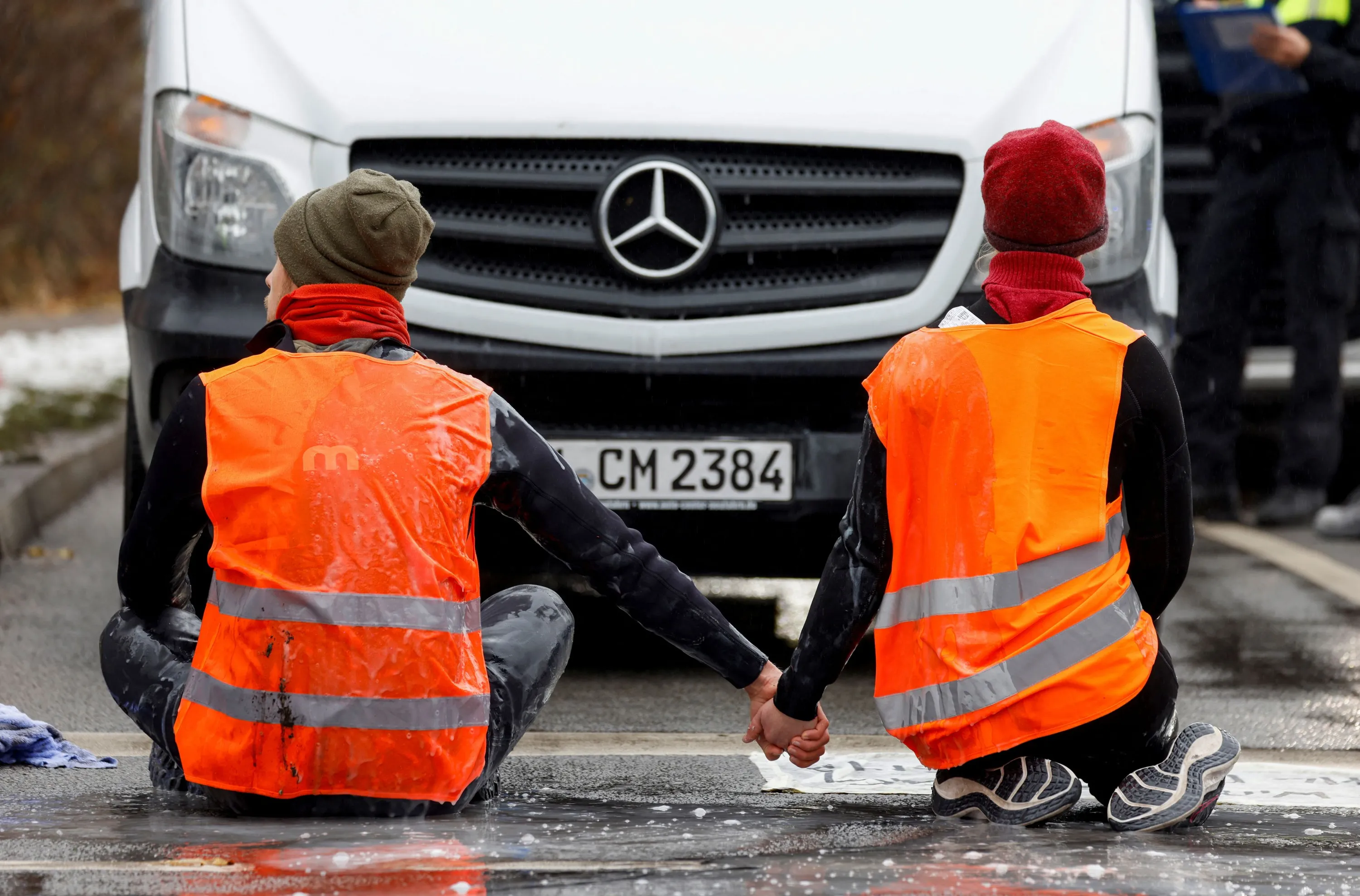 Activists of “Letzte Generation” (Last Generation) who glued themselves to a street to protest for a speed limit on highways as well as for affordable public transport, hold hands as they sit on the tarmac, in Munich, Germany on December 14, 2022. (Photo by Michaela Rehle/Reuters)