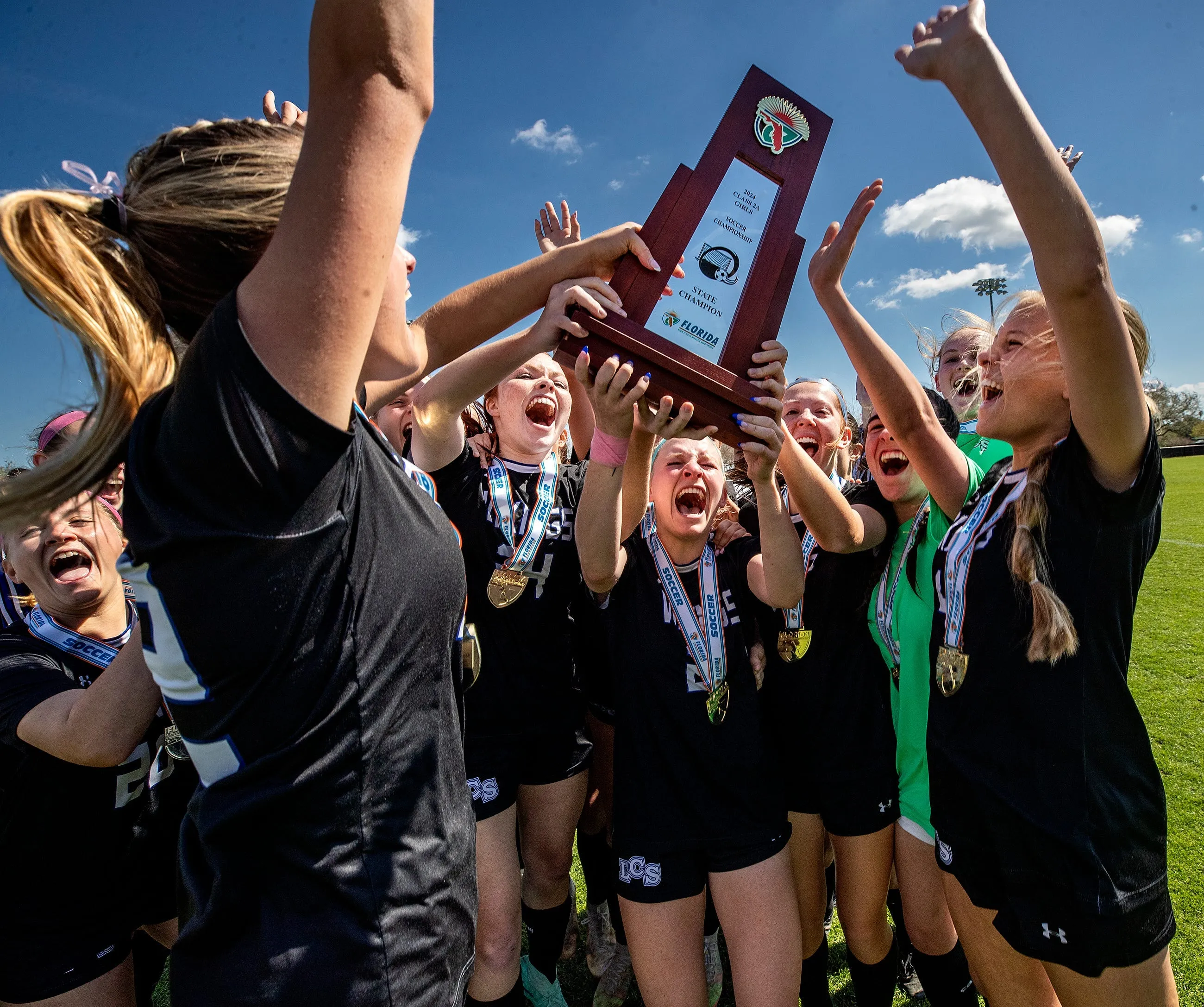 Lakeland Christian soccer players celebrate after winning the Championship game at Lake Myrtle Sports Complex in Auburndale, Florida on February 23, 2024. (Photo by Ernst Peters/The Ledger via USA TODAY Network)