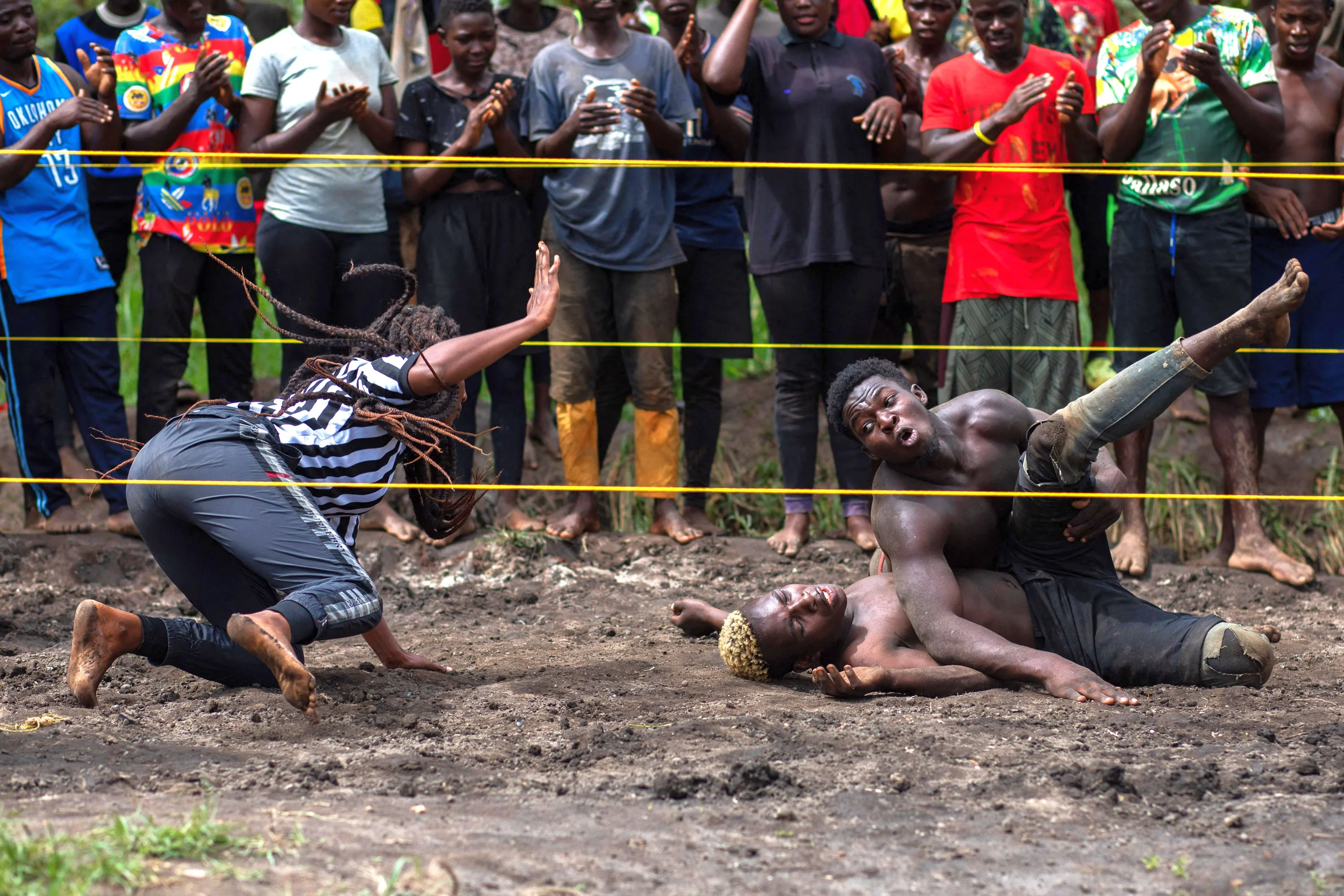 A female referee counts as member of Uganda's Soft Ground Wrestling is pinned to the ground during a training session at their camp in Mukono on February 28, 2024. (Photo by Badru Katumba/AFP Photo)