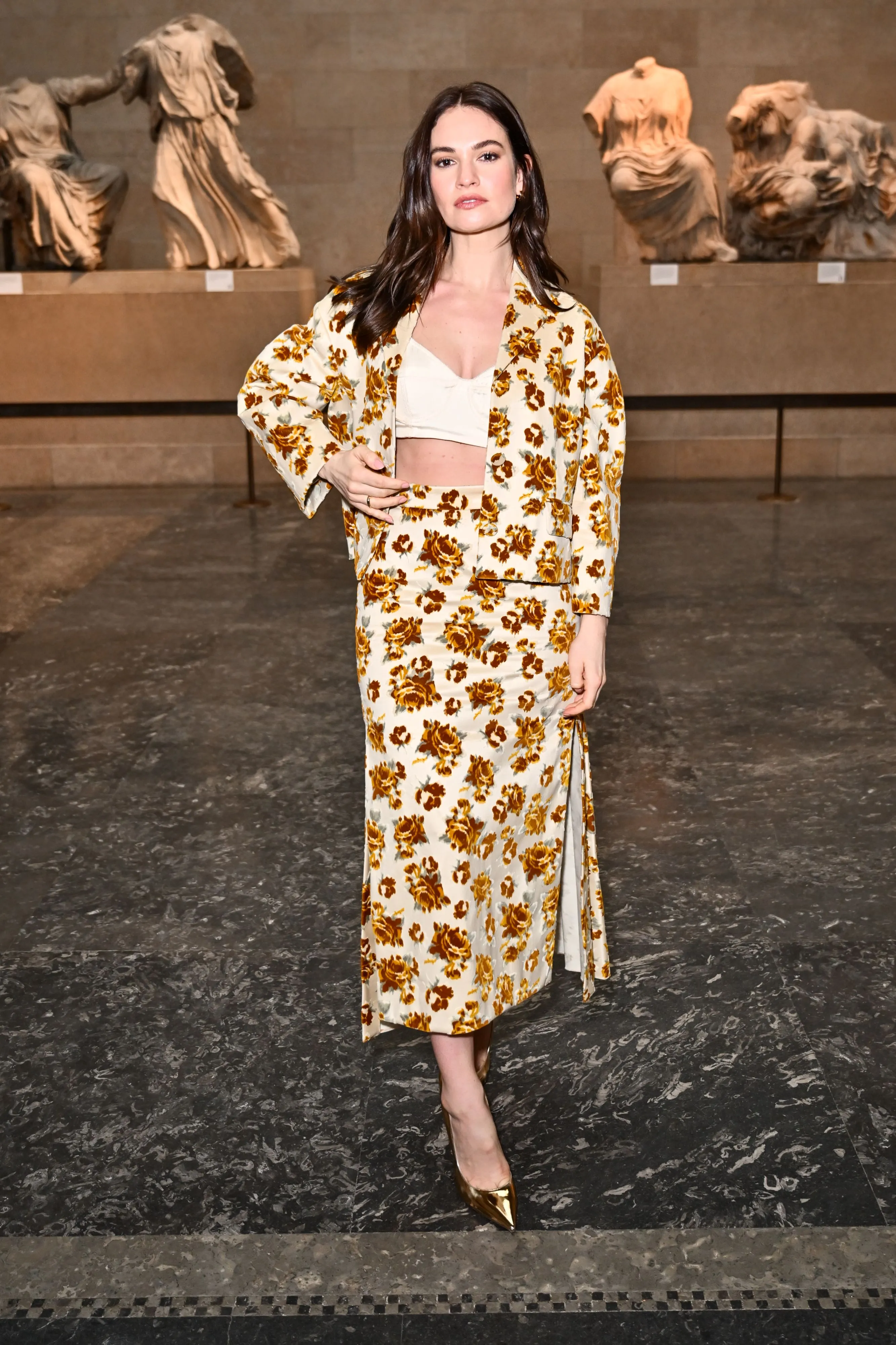 English actress Lily James attends the ERDEM show during London Fashion Week February 2024 at The British Museum on February 17, 2024 in London, England. (Photo by Jed Cullen/Dave Benett/Getty Images)