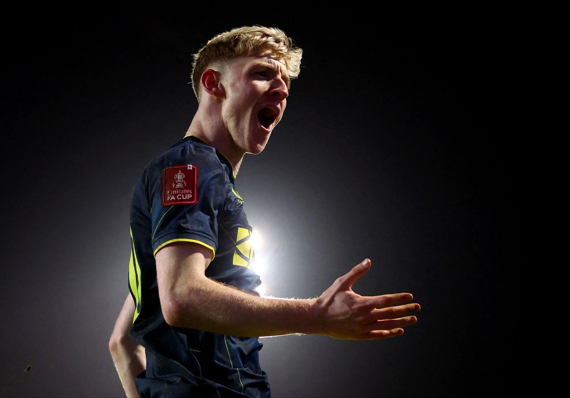 Newcastle United's Anthony Gordon celebrates scoring their side's first goal of the game during the Emirates FA Cup fifth round match at Ewood Park, Blackburn on Tuesday, February 27, 2024. (Photo by Carl Recine/Reuters)