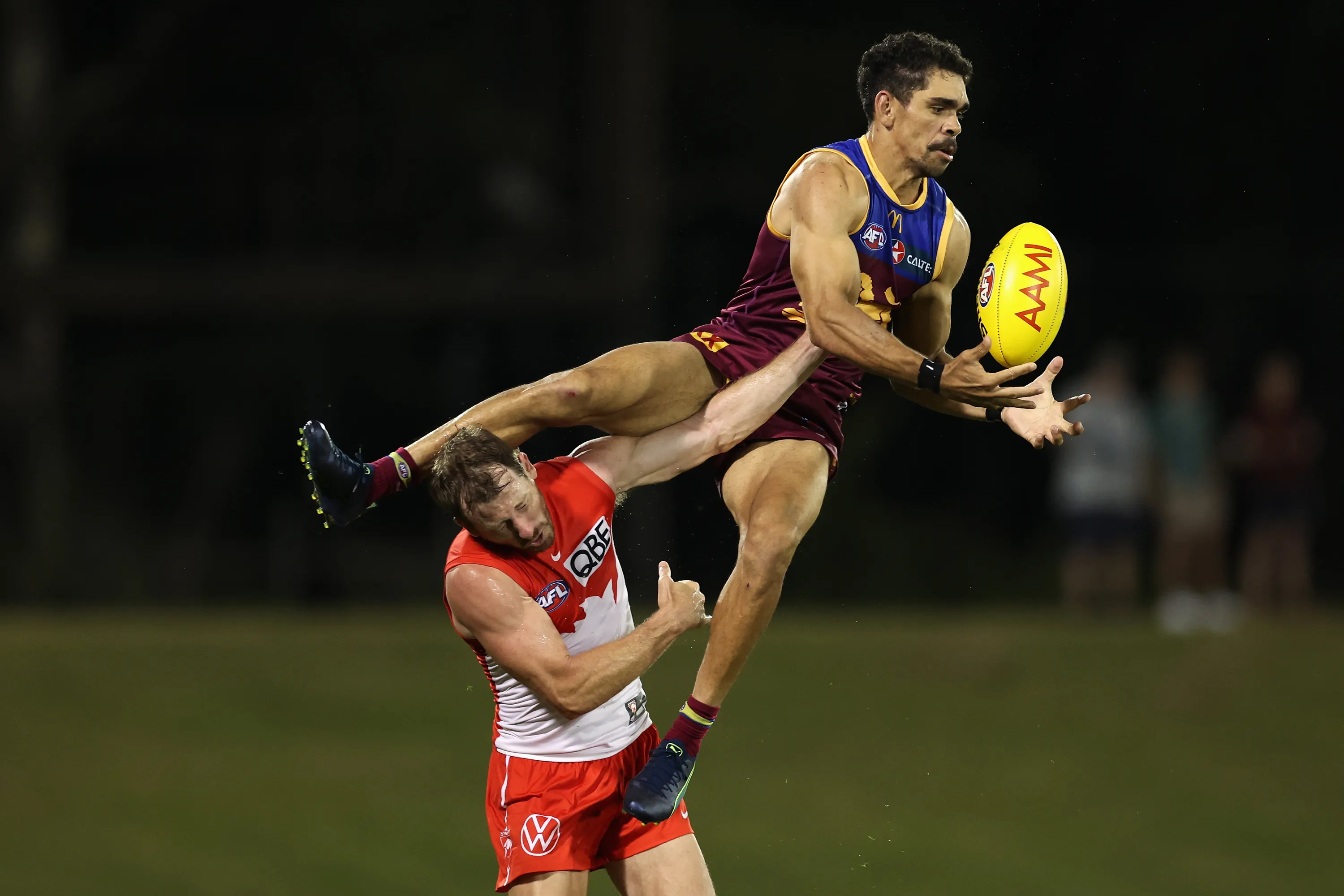 Charlie Cameron of the Lions attempts a mark over Harry Cunningham of the Swans during the 2024 AFL Community Series match between Sydney Swans and Brisbane Lions at Blacktown International Sportspark on February 29, 2024 in Sydney, Australia. (Photo by Cameron Spencer/Getty Images)