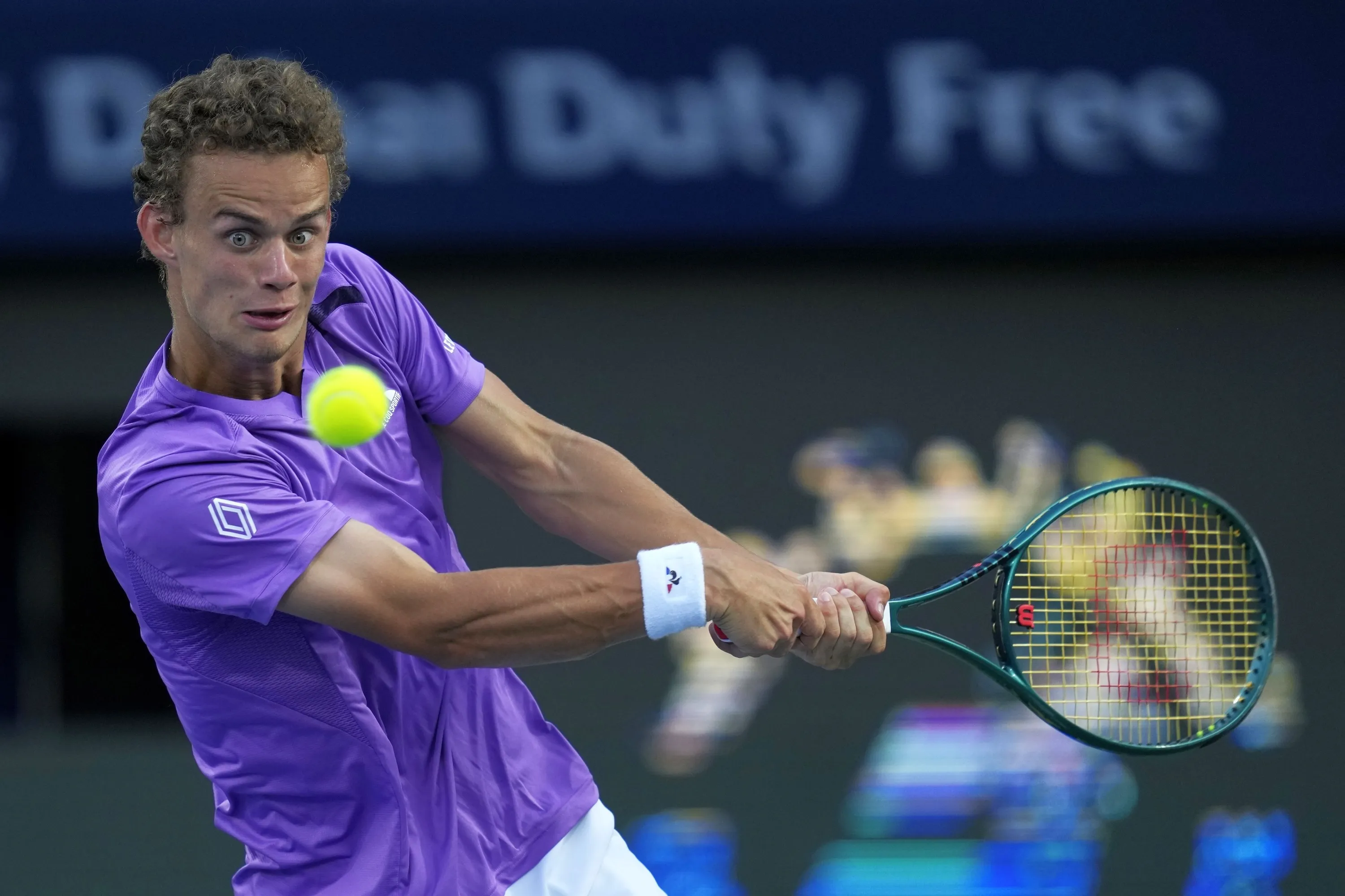 Luca Van Assche of France returns the ball to Karen Khachanov during a match of the Dubai Duty Free Tennis Championships in Dubai, United Arab Emirates, Tuesday, February 27, 2024. (Photo by Kamran Jebreili/AP Photo)