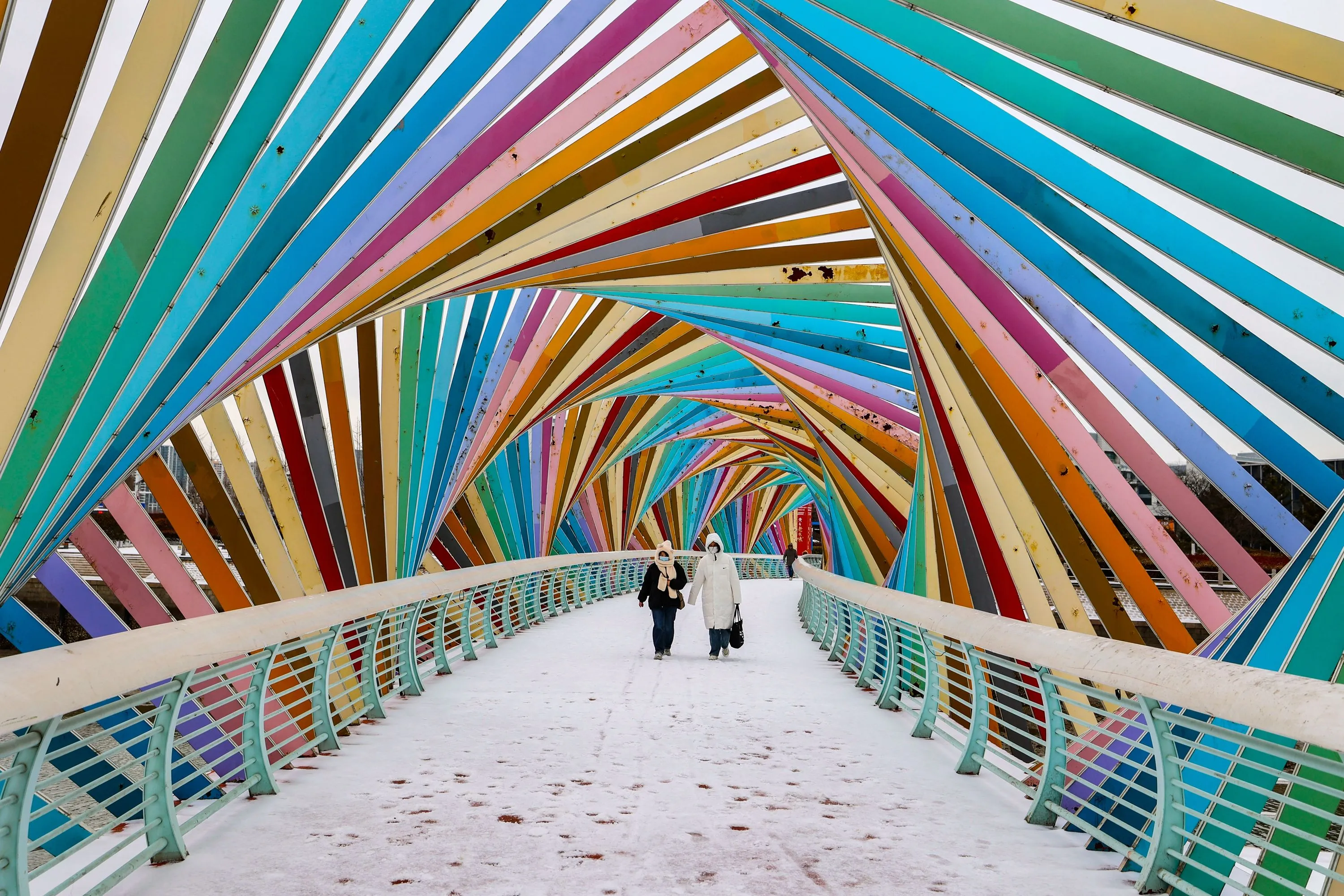 Tourists are visiting the Rainbow Bridge after snowfall in the West Coast New Area of Qingdao, Shandong Province, China, on February 20, 2024. (Photo by Costfoto/NurPhoto/Rex Features/Shutterstock)