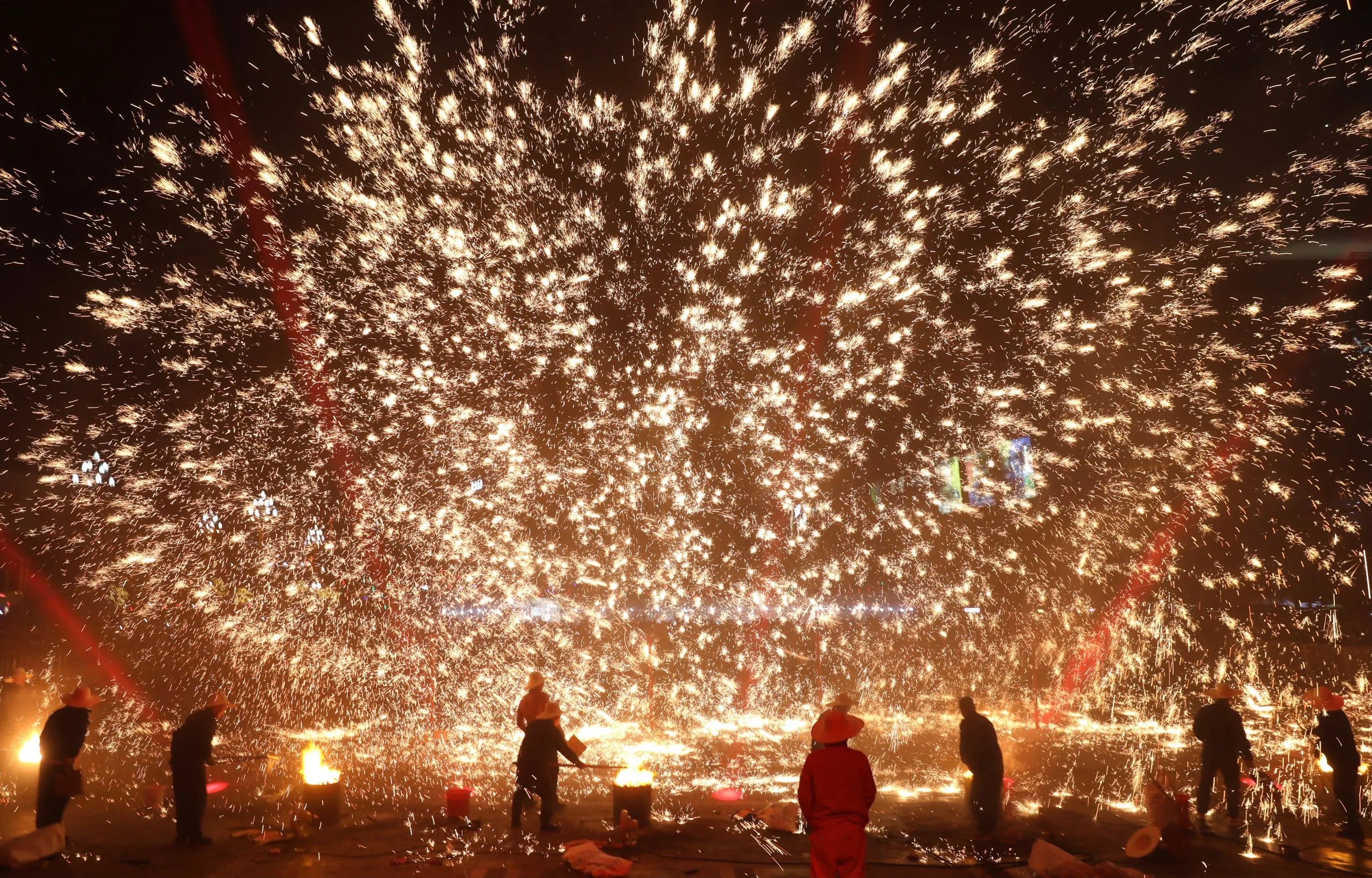 Folk artists stage a molten iron fireworks performance to celebrate the Lantern Festival on February 24, 2024 in Luding, Sichuan Province of China. Lantern Festival falls on February 24 this year. (Photo by Wang Lei/China News Service/VCG via Getty Images)