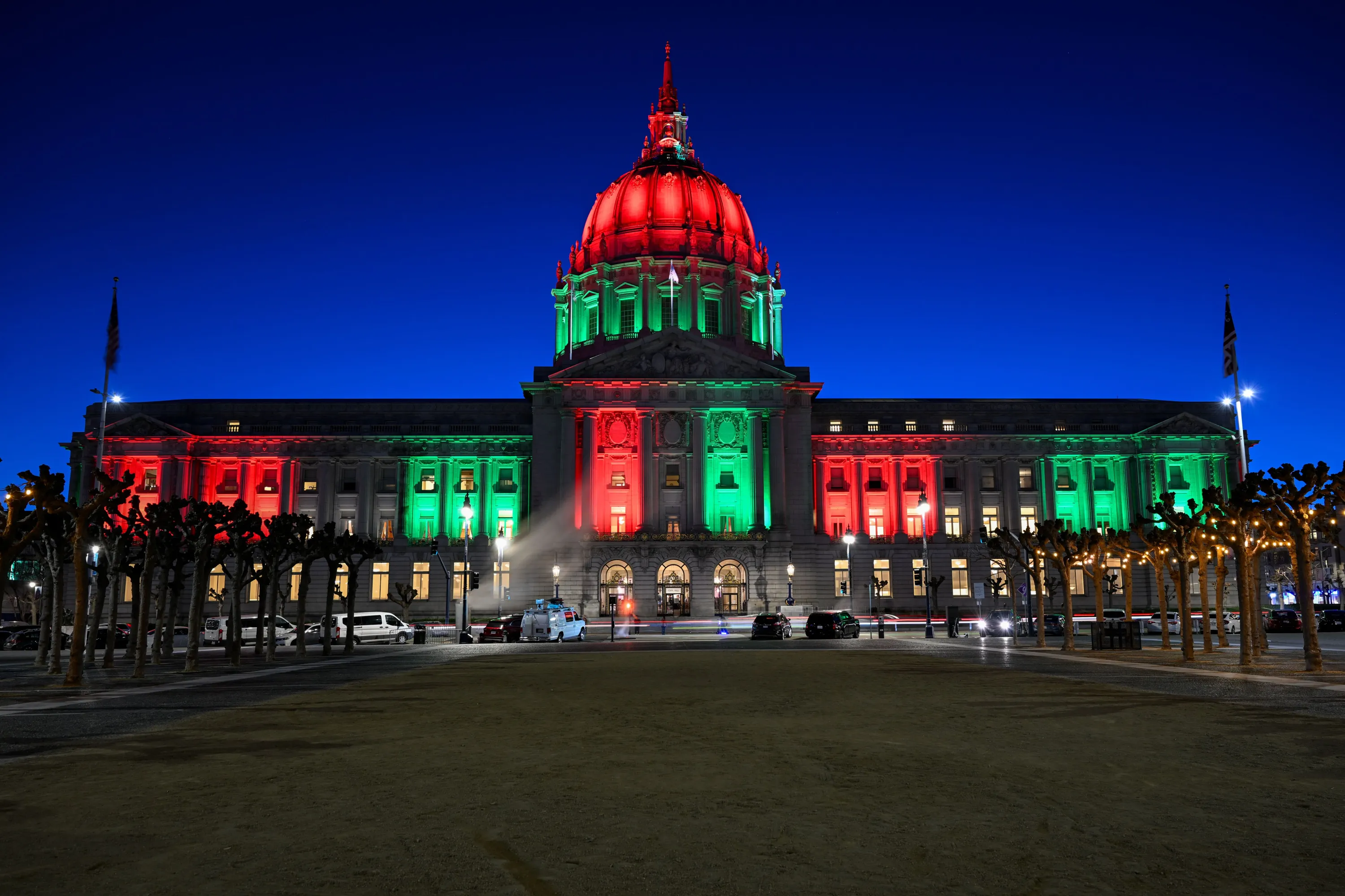 San Francisco City Hall is illuminated as Red-Green and Black during a Black History Month Celebration held at the City Hall in San Francisco, California, United States on February 28, 2024. (Photo by Tayfun Coskun/Anadolu via Getty Images)