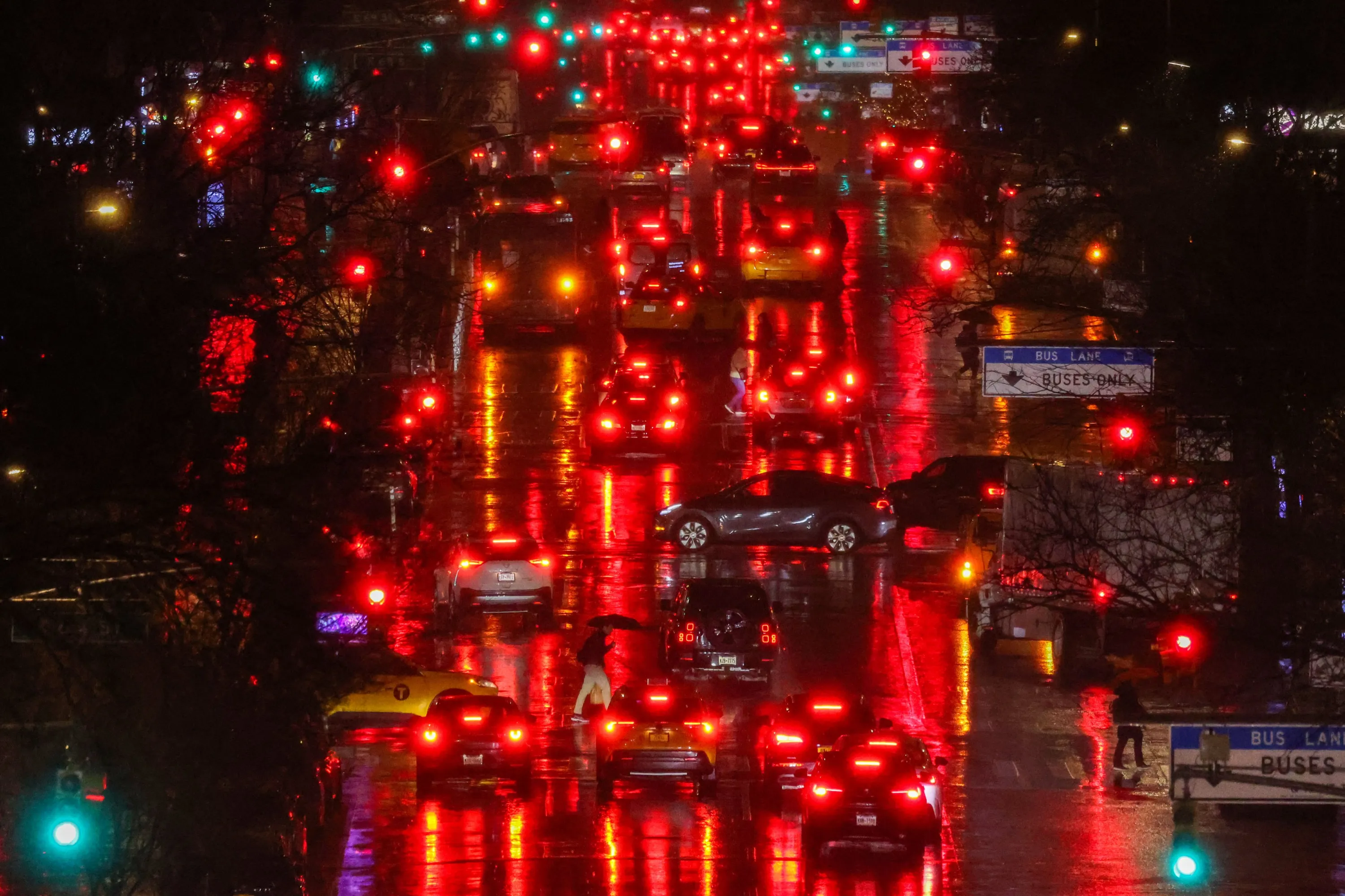 Pedestrians and cars move along First Avenue in the Manhattan borough of New York, in the pouring rain, on February 27, 2024. (Photo by Charly Triballeau/AFP Photo)