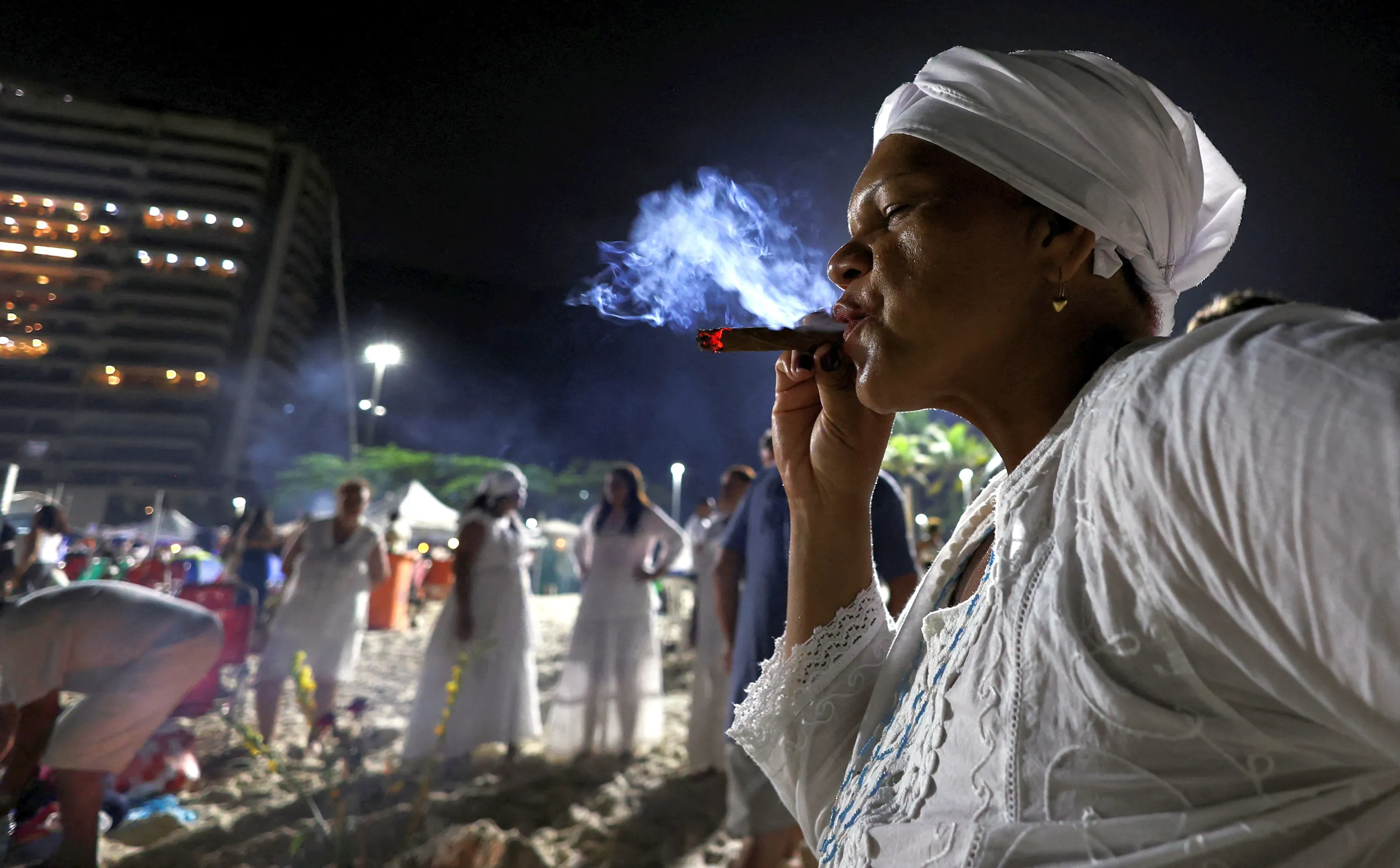 A woman smokes as people make offerings to the Afro-Brazilian goddess of the sea, Lemanja, at Copacabana beach during New Year celebrations, in Rio de Janeiro, Brazil on December 31, 2022. (Photo by Aline Massuca/Reuters)