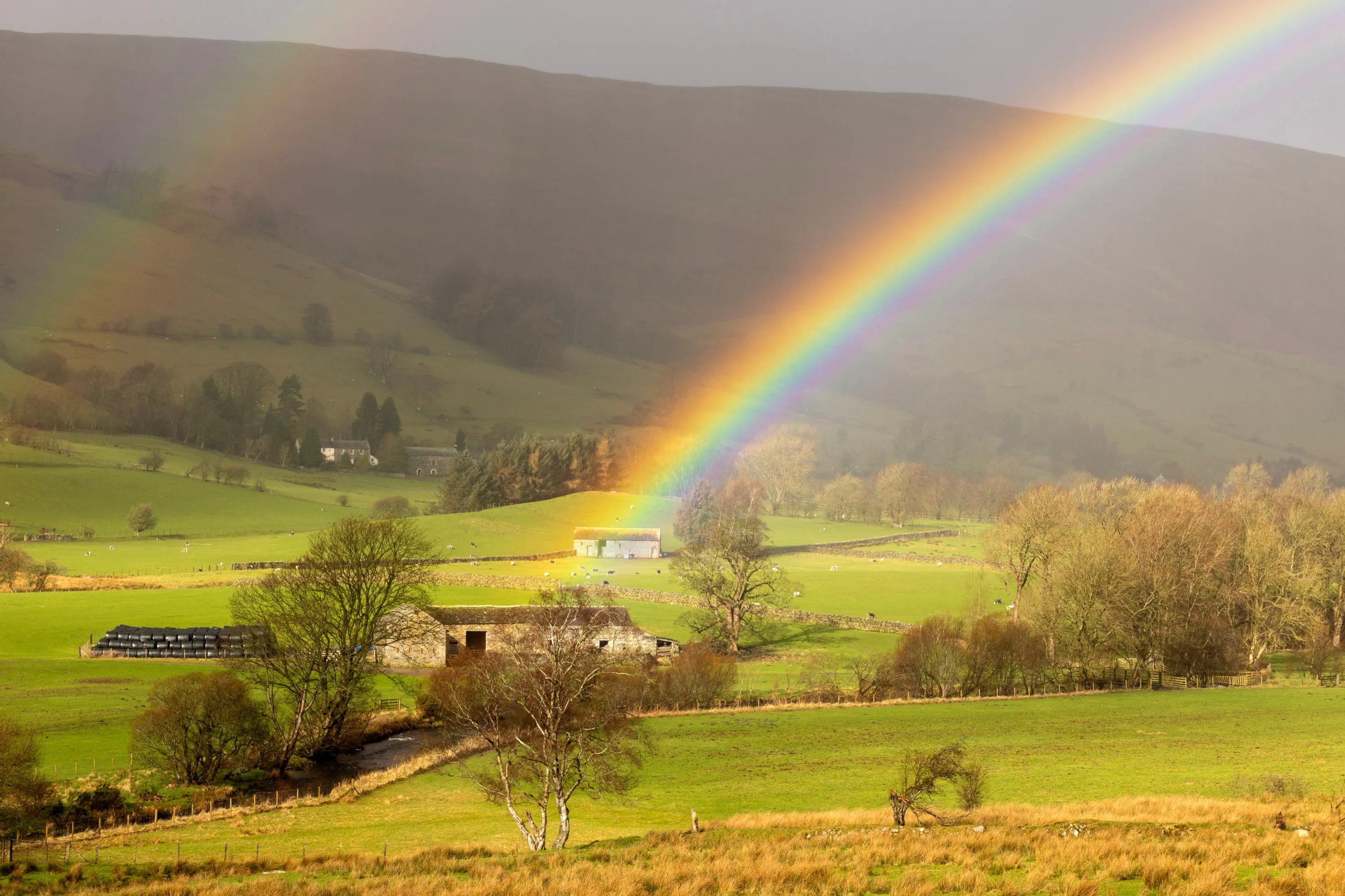 A rainbow appears to strike gold on a farm near Threlkeld, just outside Keswick in Cumbria, UK in the last decade of February 2024. (Photo by Andrew McCaren for The Times)