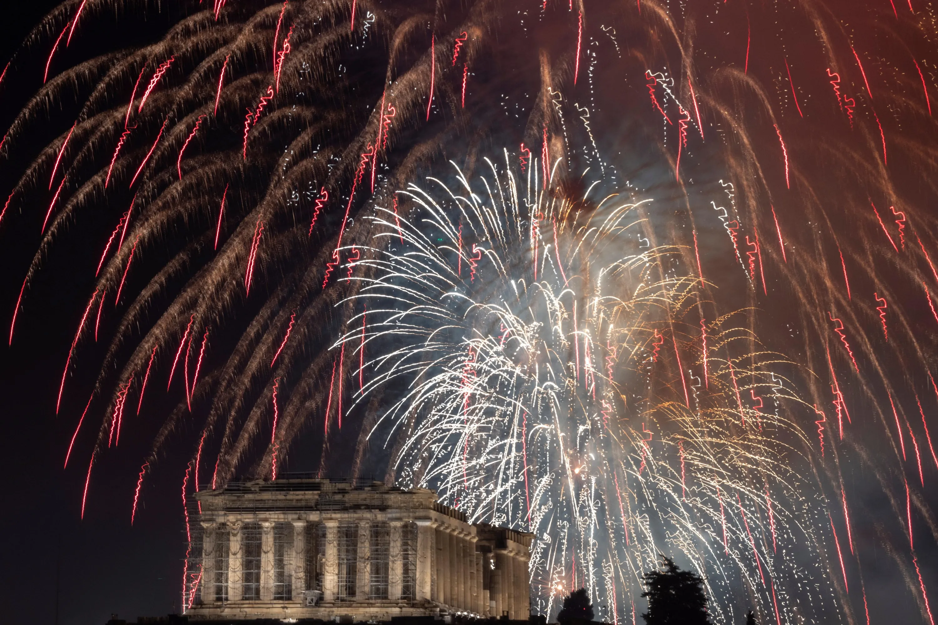 Fireworks explode over the ancient Parthenon temple atop the Acropolis hill during New Year's Day celebrations, in Athens, Greece on January 1, 2023. (Photo by Stelios Misinas/Reuters)