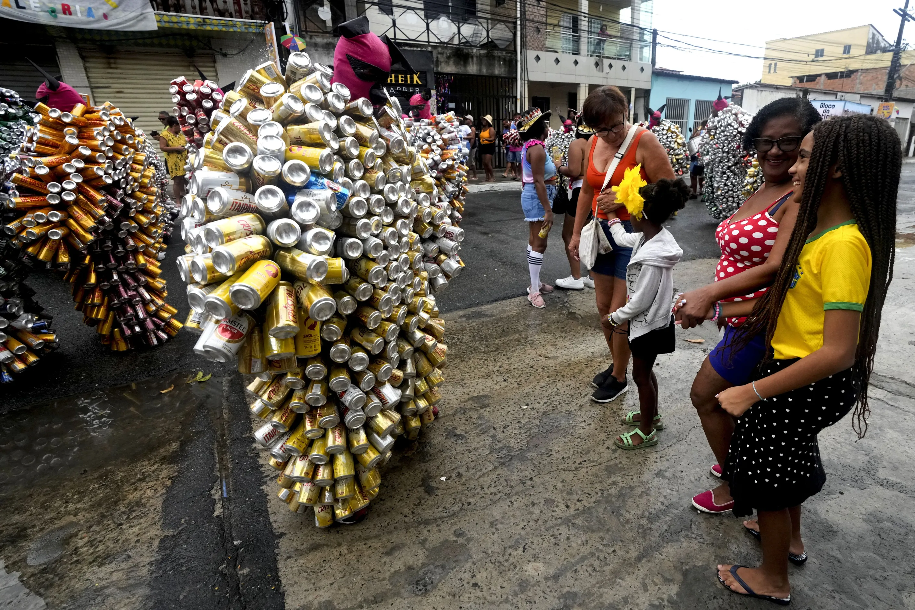 Locals watch revelers wearing costumes made from beer and soda cans during the “Bloco da Latinha” street party Carnival parade in Madre de Deus, Brazil, Sunday, February 11, 2024. (Photo by Eraldo Peres/AP Photo)