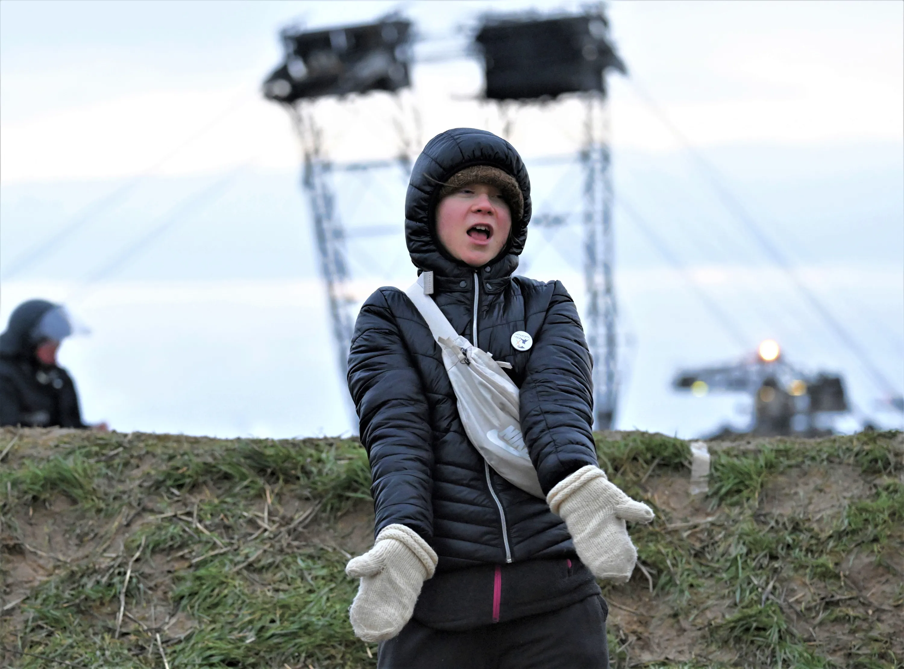 Climate activist Greta Thunberg stands between Keyenberg and Lützerath under police guard on the edge of the open pit mine and dances in Erkelenz, Germany, Sunday, January 15, 2023. The energy company RWE wants to excavate the coal lying under Luetzerath, for this purpose, the hamlet on the territory of the city of Erkelenz at the opencast lignite mine Garzweiler II is to be demolished. (Photo by Federico Gambarini/dpa via AP Photo)