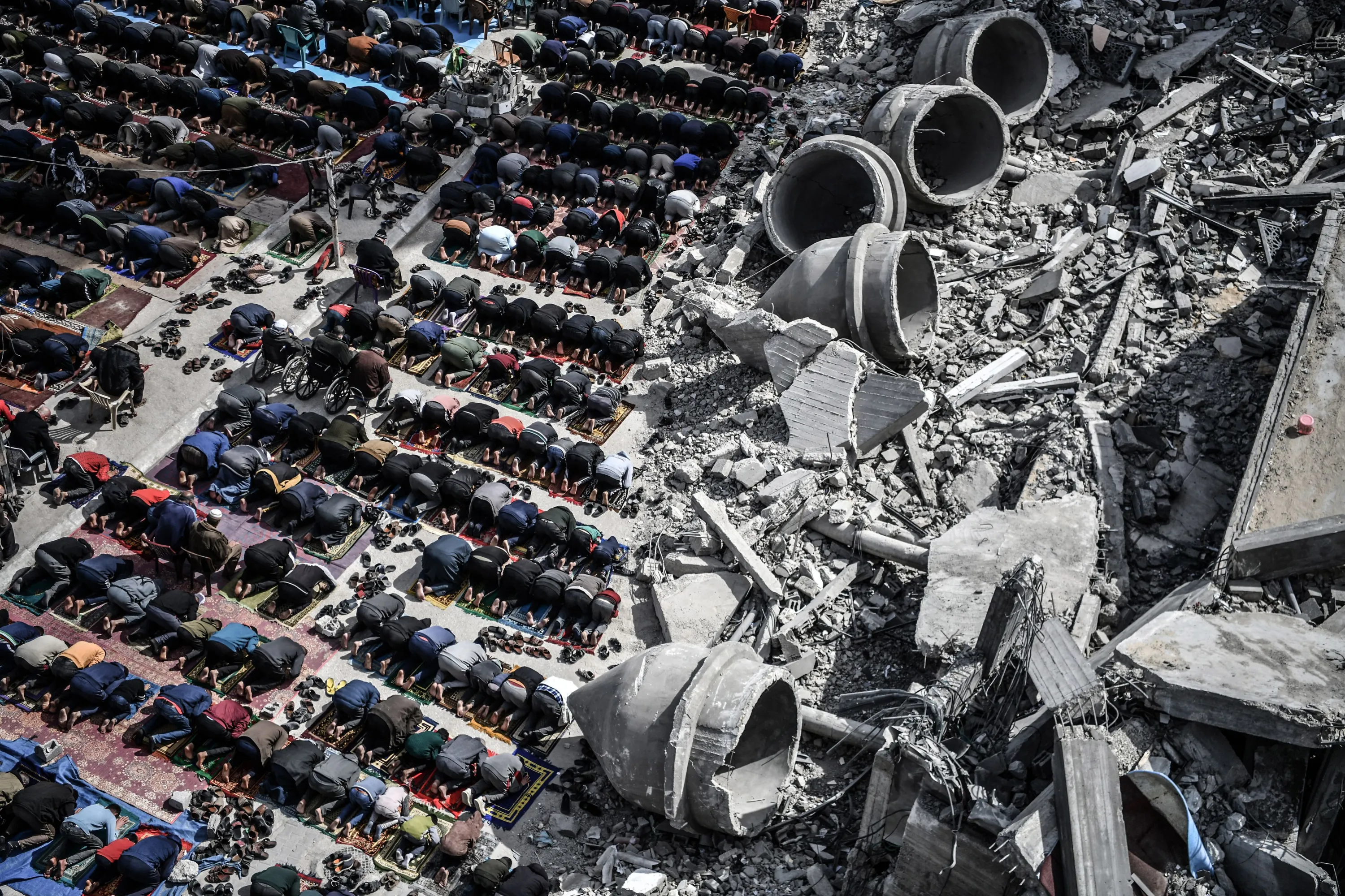 An aerial view of Palestinians performing Friday prayers among the rubble of the Al-Farooq Mosque, destroyed in an Israeli attack on March 01, 2024 in Rafah, Gaza. (Photo by Abed Zagout/Anadolu via Getty Images)