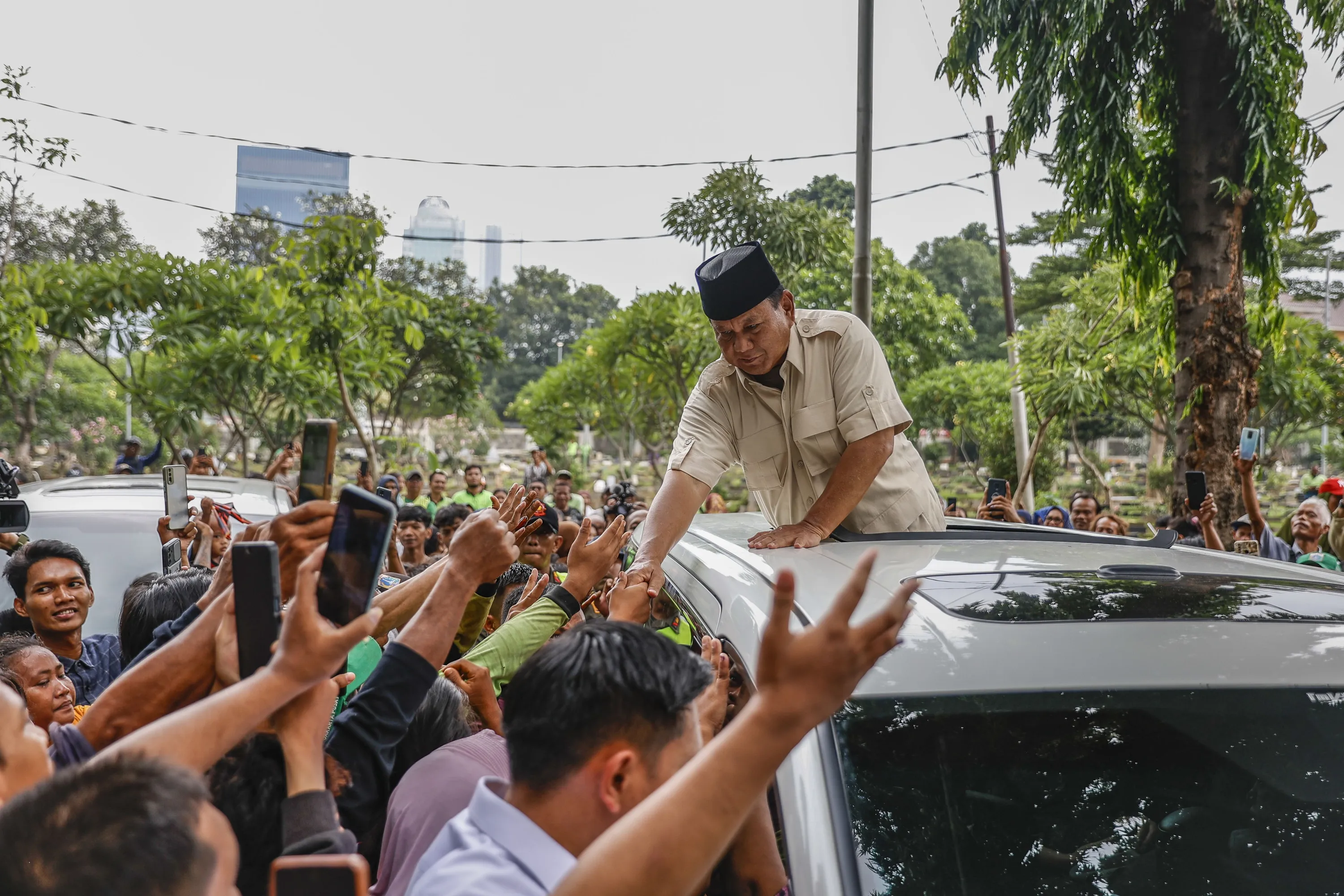 Indonesian presidential candidate Prabowo Subianto (C) greets his supporters after visiting his father’s grave at a cemetery in Jakarta, Indonesia, 15 February 2024. Prabowo has claimed victory in Indonesia’s Presidential Elections over rivals Anies Baswedan and Ganjar Pranowo based on early counts. (Photo by Mast Irham/EPA)