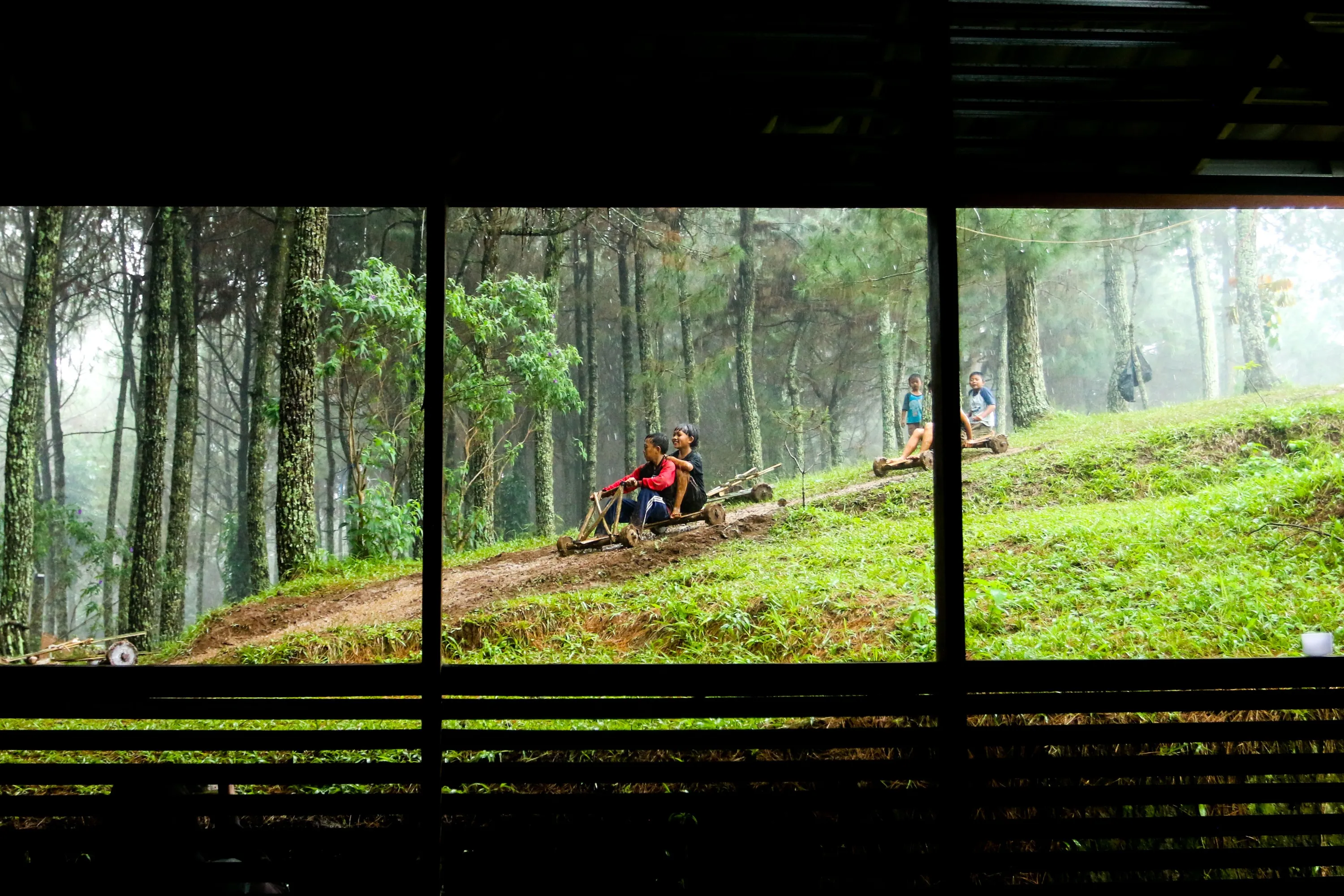 Children are riding Kadaplak in Kampung Pasir Angling, Bandung, Indonesia, on February 26, 2024. Kadaplak is an extreme traditional game made from bamboo and is often held as public entertainment. In the past, Kadaplak was a traditional means of transportation for farmers, which is now being preserved and reintroduced as a traditional game to the community. (Photo by Ryan Suherlan/NurPhoto/Rex Features/Shutterstock)