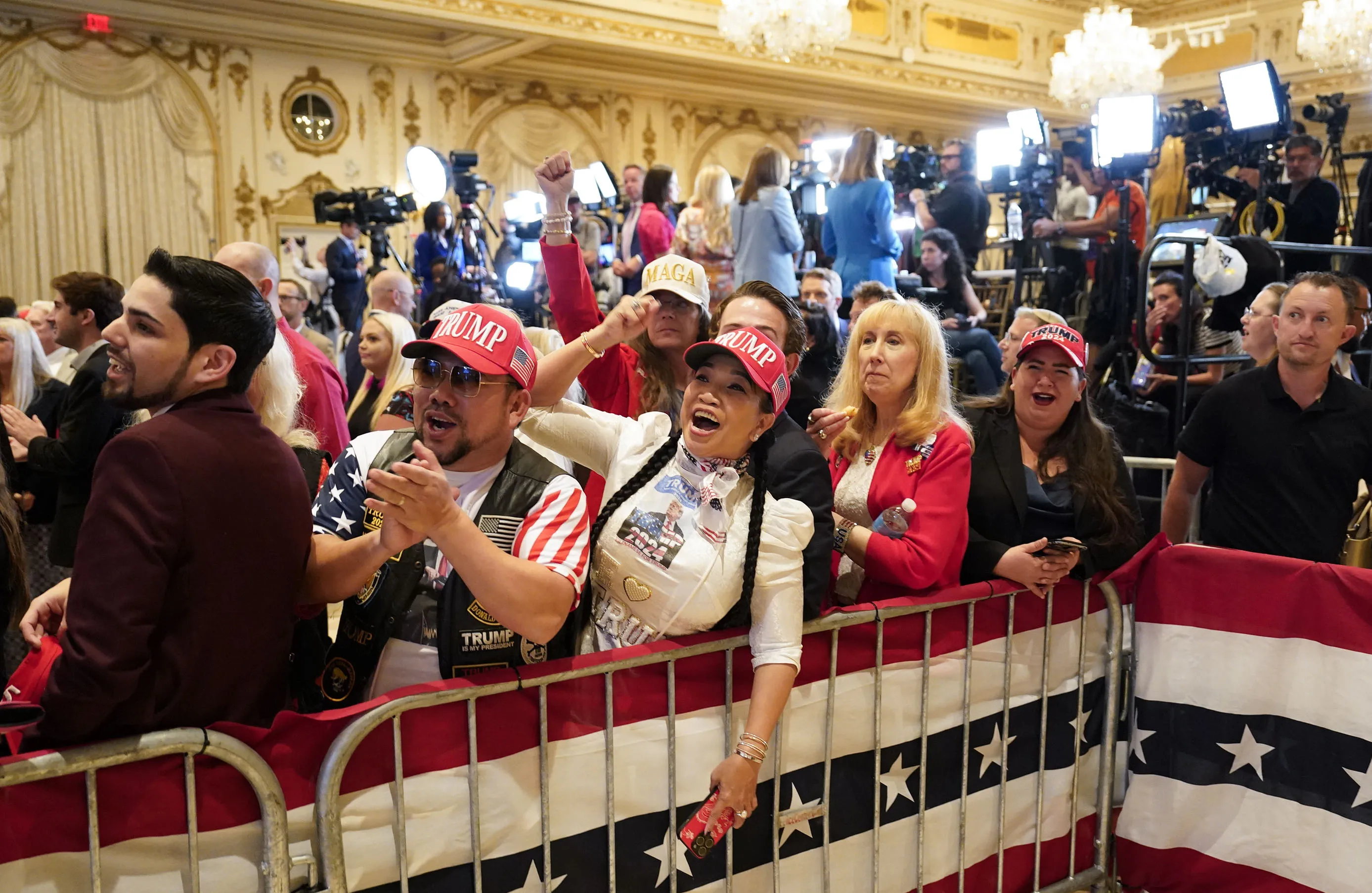 Supporters cheer election results as they wait for Republican presidential candidate former President Donald Trump to speak at a Super Tuesday election night party on Tuesday, March 5, 2024 at Mar-a-Lago in Palm Beach, Fla. (Photo by Jabin Botsford /The Washington Post)