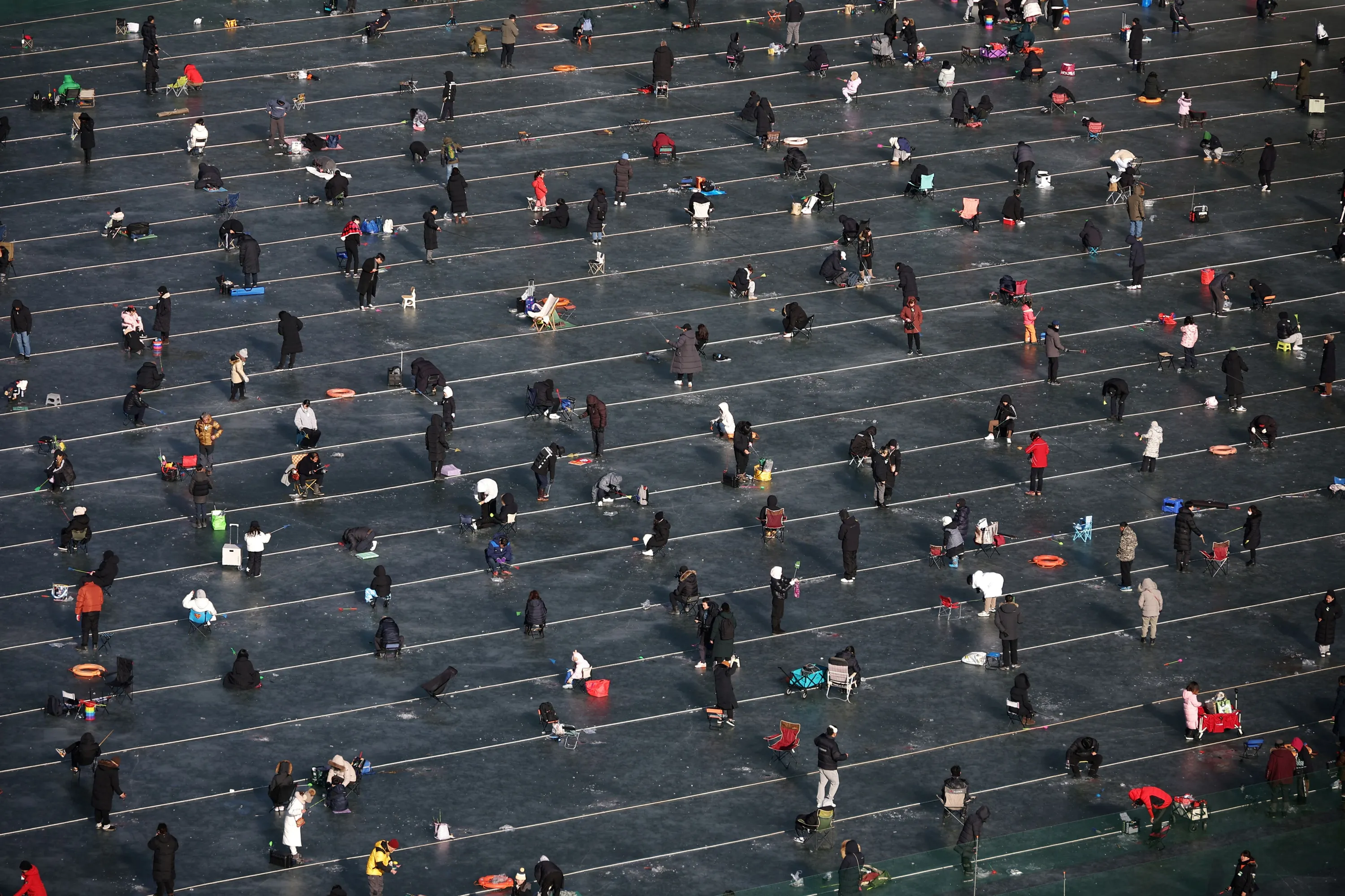 People fish for trout on a frozen river during the Hwacheon Ice Festival in Hwacheon, south of the demilitarized zone (DMZ) separating the two Koreas, South Korea on January 6, 2024. (Photo by Kim Hong-Ji/Reuters)