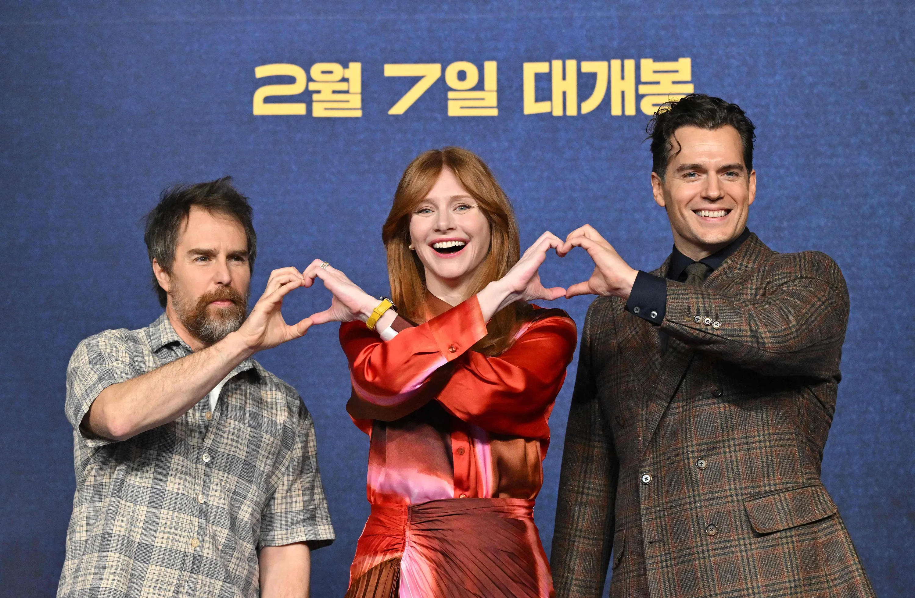 (From L to R) US actors Sam Rockwell and Bryce Dallas Howard pose with British actor Henry Cavill for photos during a press conference to promote their film “Argylle” in Seoul on January 18, 2024. (Photo by Jung Yeon-je/AFP Photo)