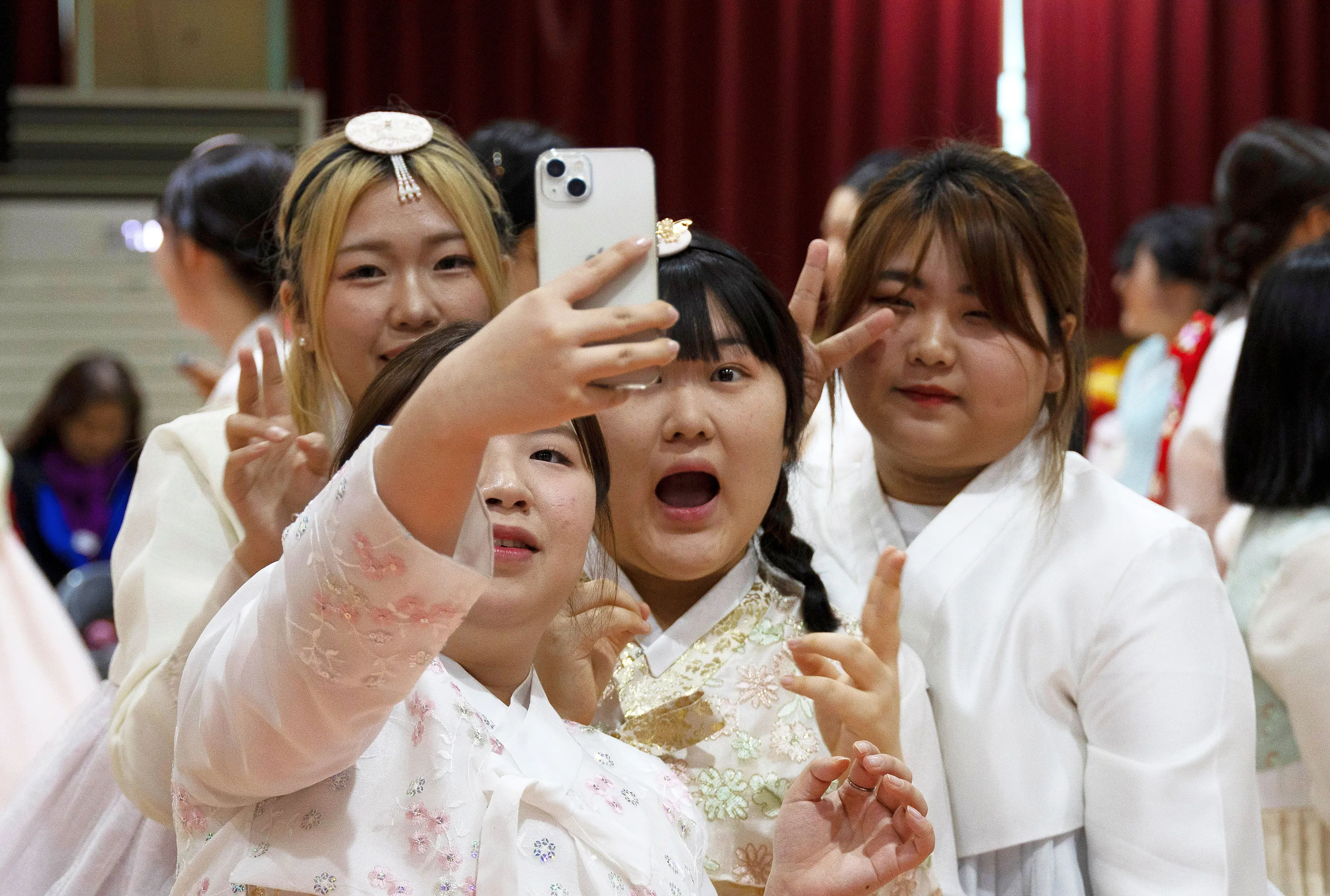 Graduates wearing traditional Korean clothes take a selfie during their graduation ceremony at the Dongmyung Girls High School in Seoul, South Korea, on February 6, 2024. (Photo by Jeon Heon-Kyun/EPA/EFE)