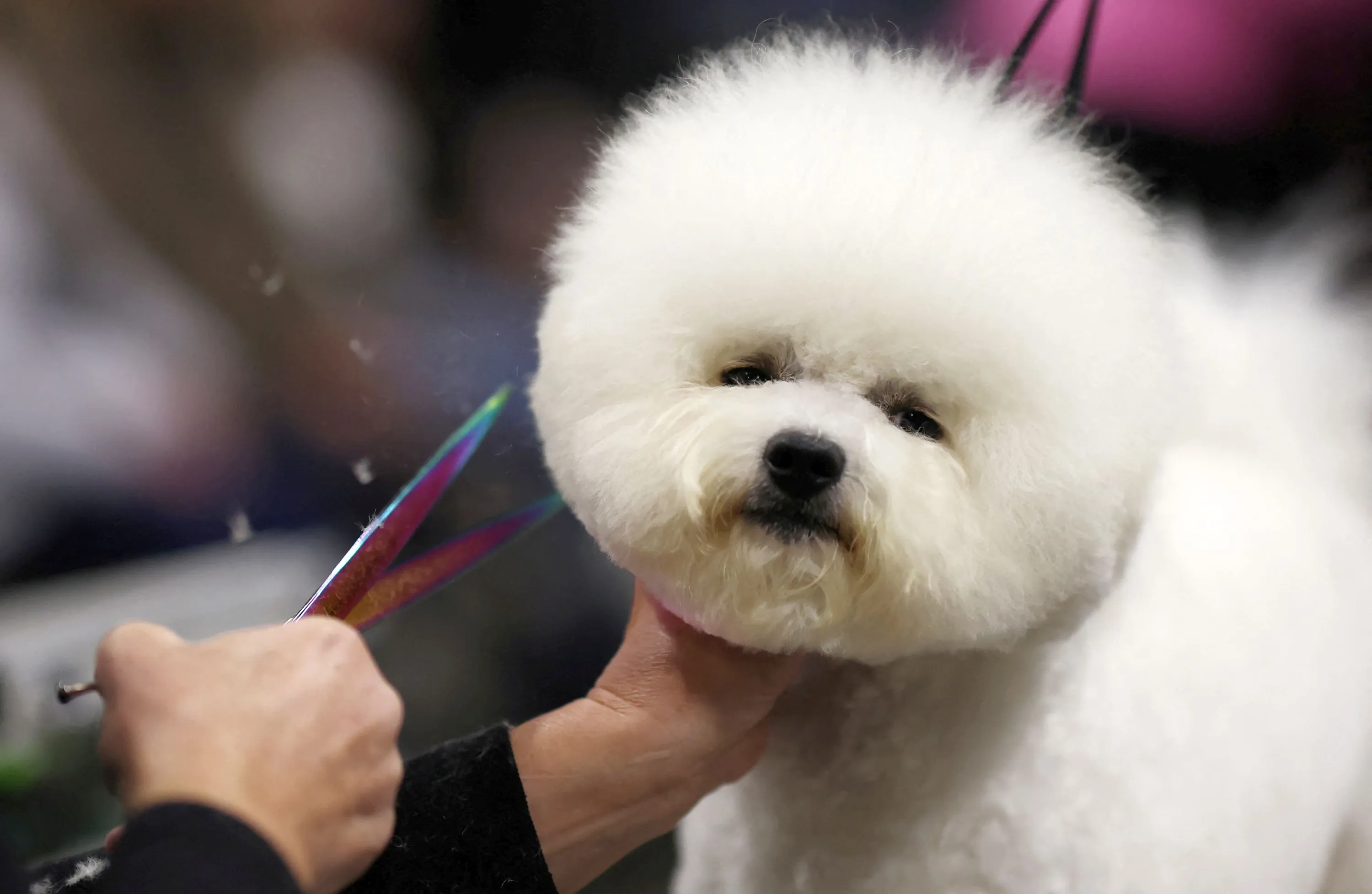 An owner trims the fur of her Bichon Frise ahead of judging on the first day of the Crufts dog show in Birmingham, Britain, on March 7, 2024. (Photo by Phil Noble/Reuters)