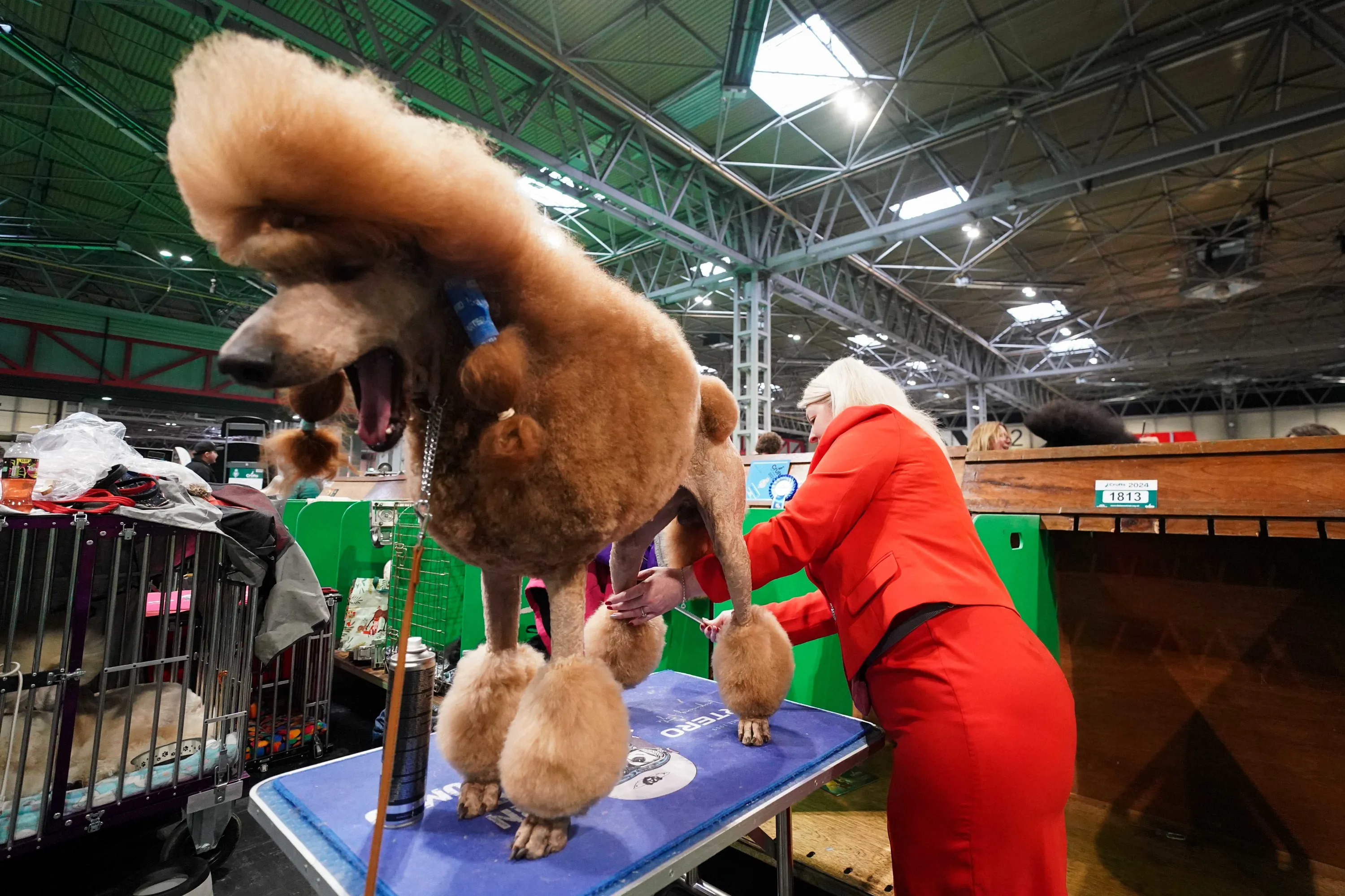 A Standard Poodle is groomed by their owner during the first day of the Crufts Dog Show at the National Exhibition Centre (NEC) in Birmingham on Thursday, March 7, 2024. (Photo by Jacob King/PA Images via Getty Images)