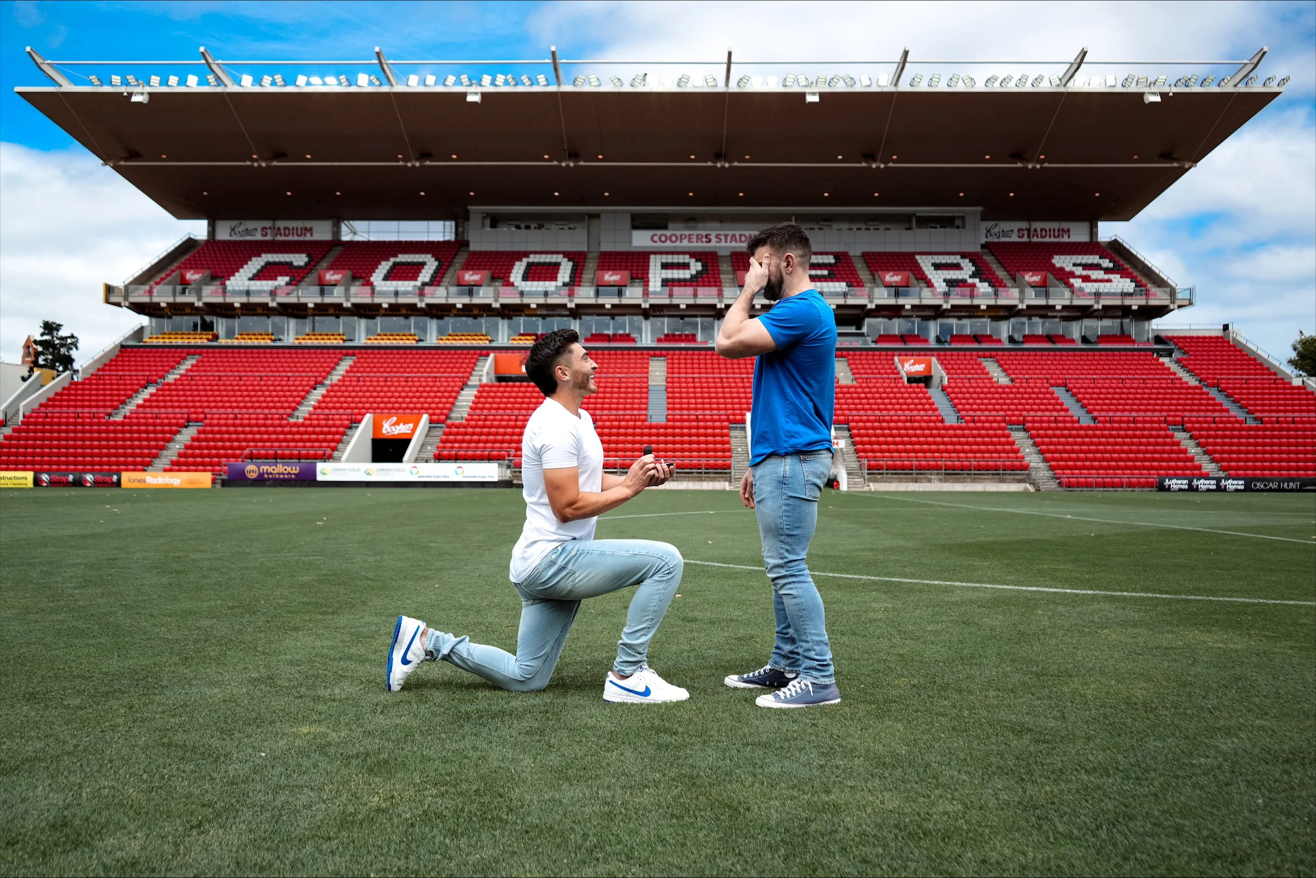 Josh Cavallo, Australia's first active male professional footballer to come out as gay, proposes to his partner at Adelaide United's home ground in Adelaide, Australia, on December 27, 2023. (Photo by Courtney Pedlar via Reuters)