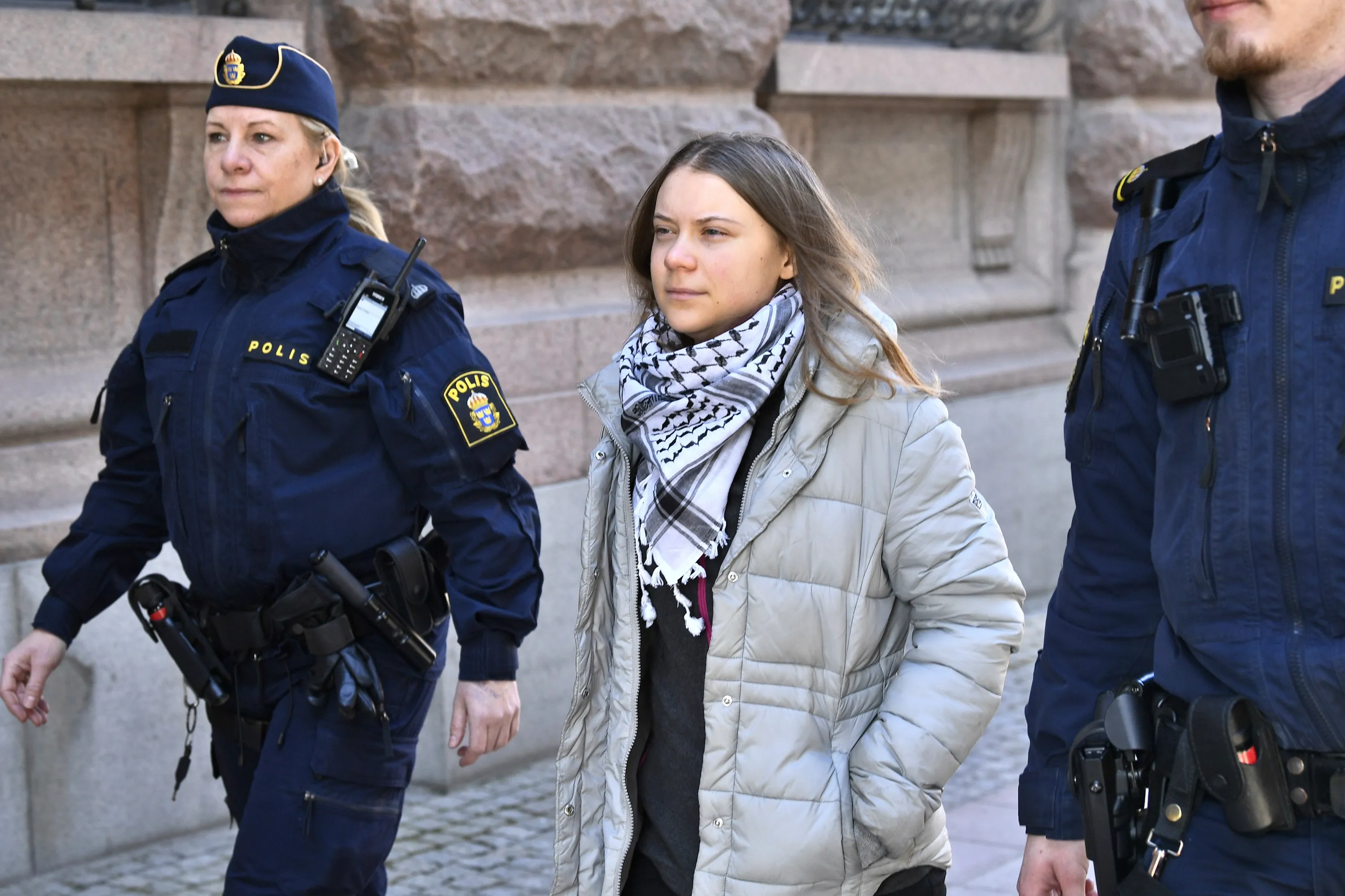 Swedish climate activist Greta Thunberg (C) is led away by police after being arrested during a sit in outside the Swedish parliament, the Riksdagen, to demonstrate for climate action, on March 12, 2024 in Stockholm, Sweden. (Photo by Samuel Steen/TT News Agency via AFP Photo)