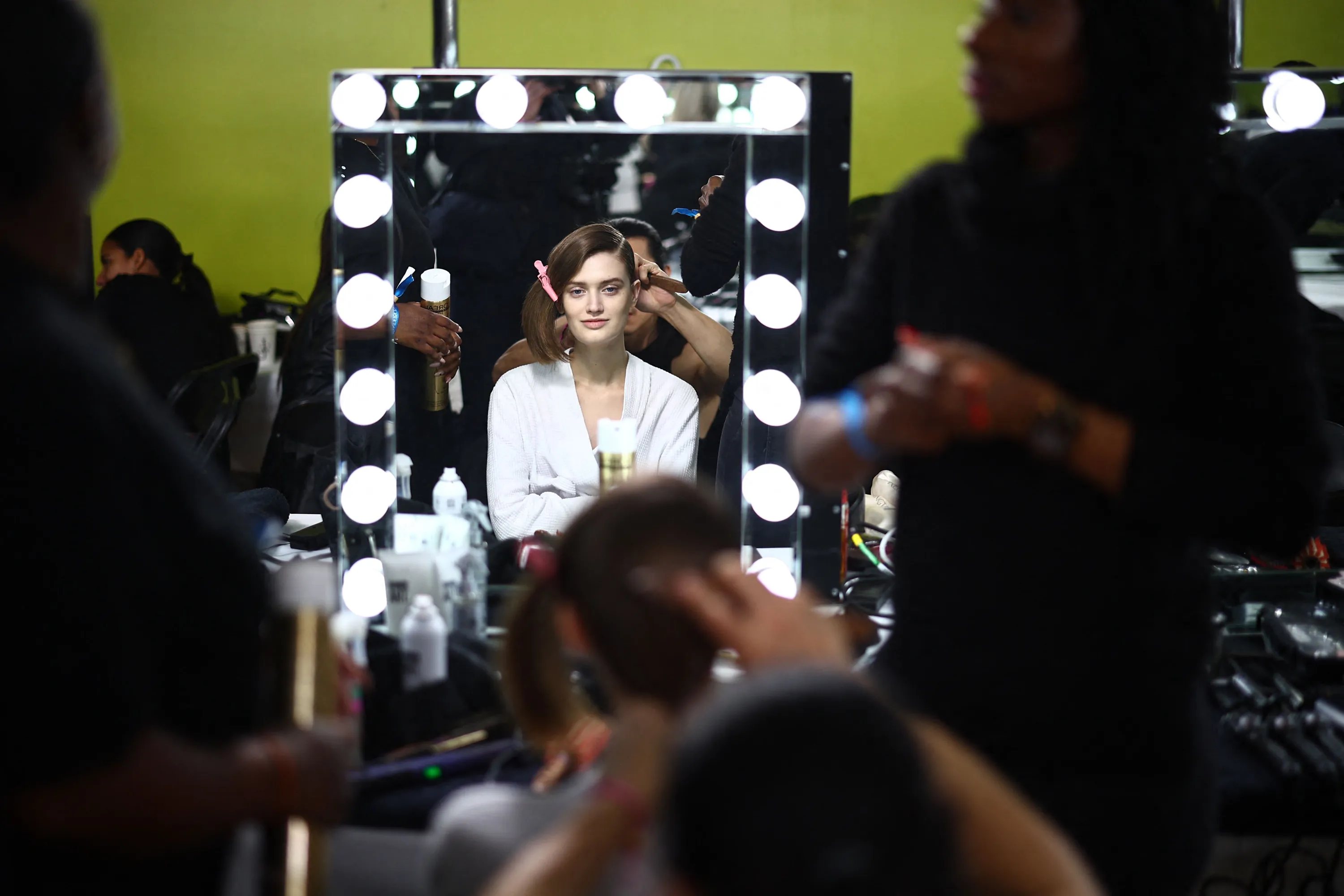 A model is prepared back-stage ahead of the catwalk presentation for British fashion label JW Anderson for their Autumn/Winter 2024 collection during London Fashion Week in London on February 18, 2024. (Photo by Henry Nicholls/AFP Photo)