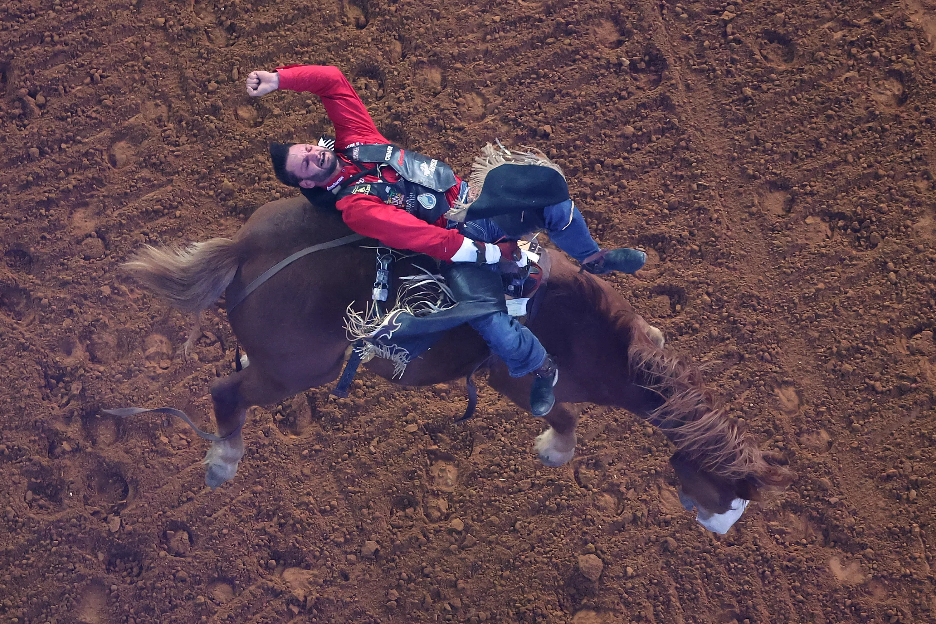 Taylor Broussard, riding Gander Goose, competes in the bareback riding event during The American Rodeo by Teton Ridge at Globe Life Field on March 09, 2024 in Arlington, Texas. (Photo by Al Bello/Getty Images for Teton Ridge)