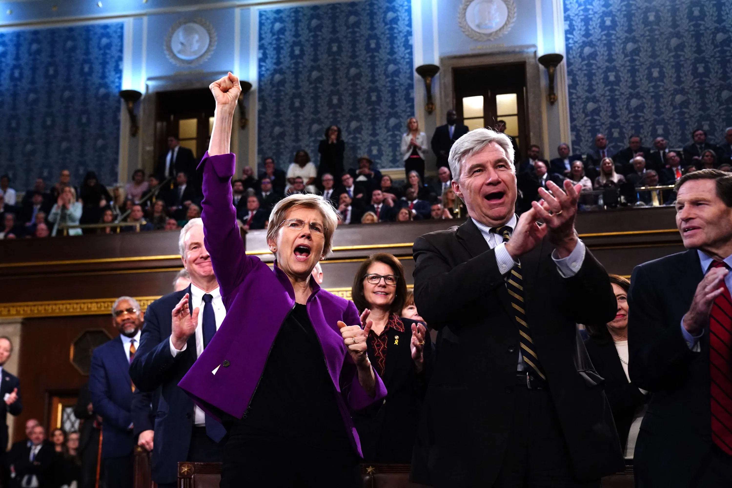 Democratic Senators Elizabeth Warren from Massachusetts (L) and Sheldon Whitehouse from Rhode Island (L) cheer as US President Joe Biden delivers his third State of the Union address in the House Chamber of the US Capitol in Washington, DC, on March 7, 2024. (Photo by Shawn Thew/Pool via AFP Photo)