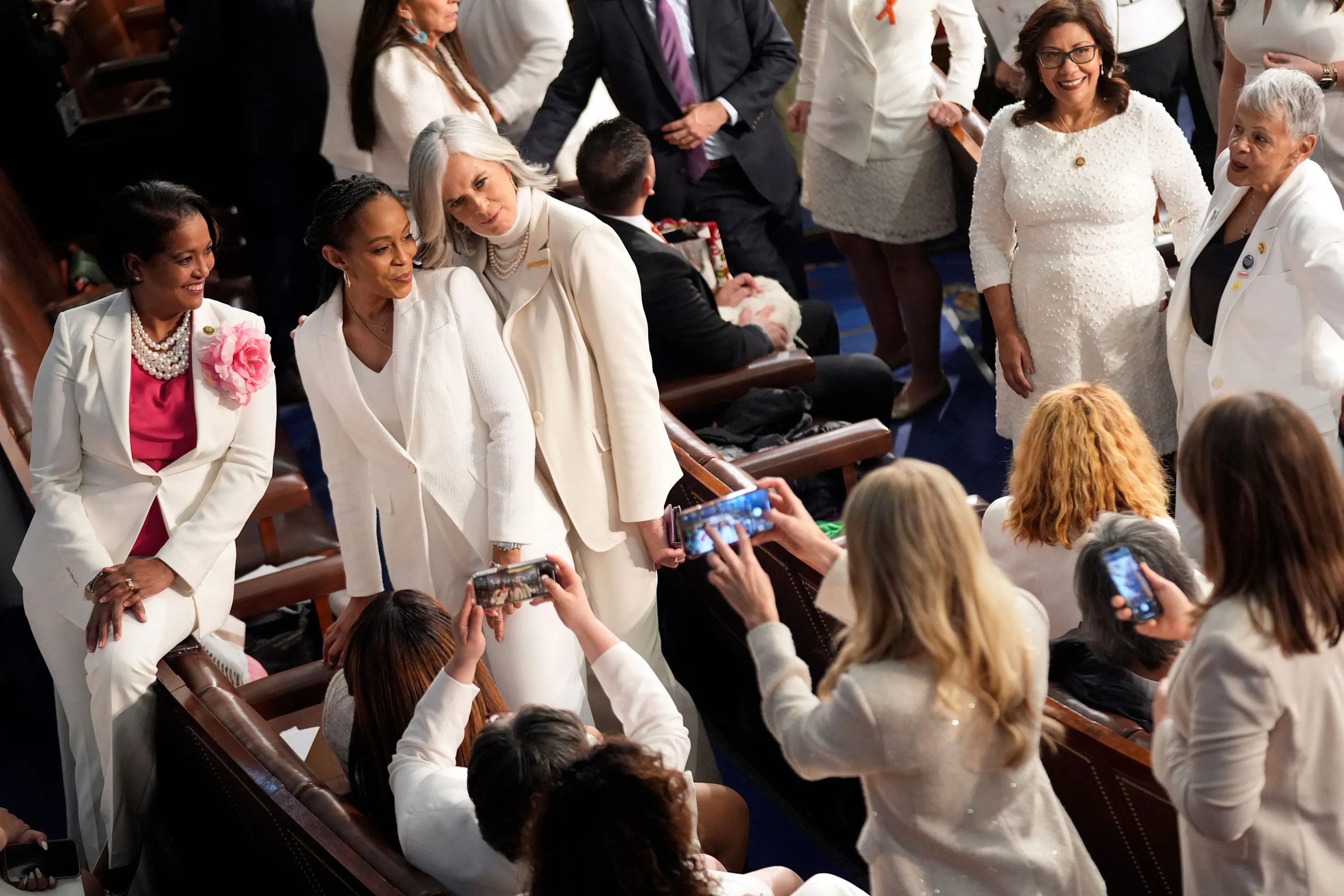 Democratic members of Congress, wearing white to support reproductive rights, pose for a photo before President Joe Biden delivers the State of the Union address to a joint session of Congress at the U.S. Capitol, Thursday March 7, 2024, in Washington. (Photo by Andrew Harnik/AP Photo)