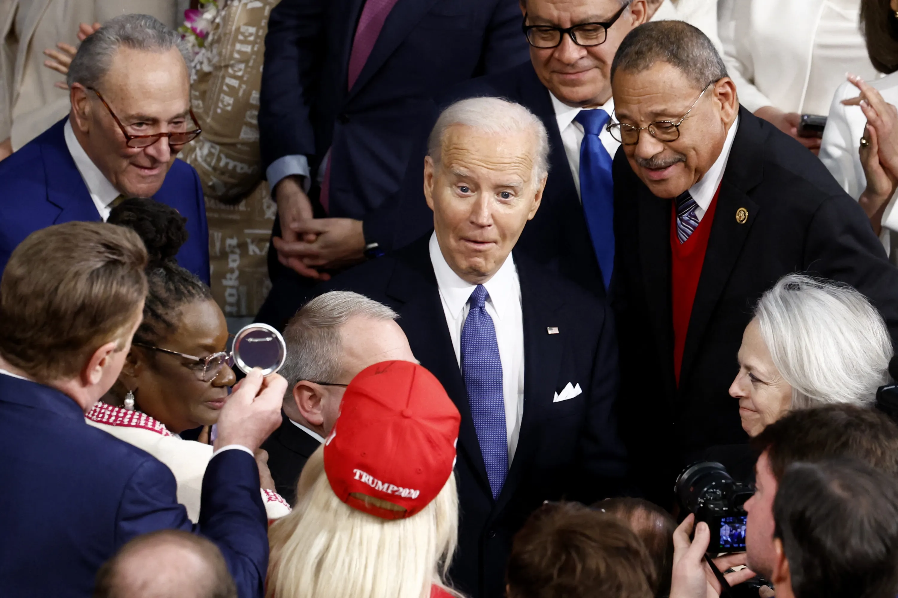 U.S. President Joe Biden reacts as he looks at U.S. Representative Marjorie Taylor Greene (R-GA) as he arrives in the chamber before delivering the State of the Union address at the U.S. Capitol in Washington, D.C., March 7, 2024. (Photo by Evelyn Hockstein/Reuters)