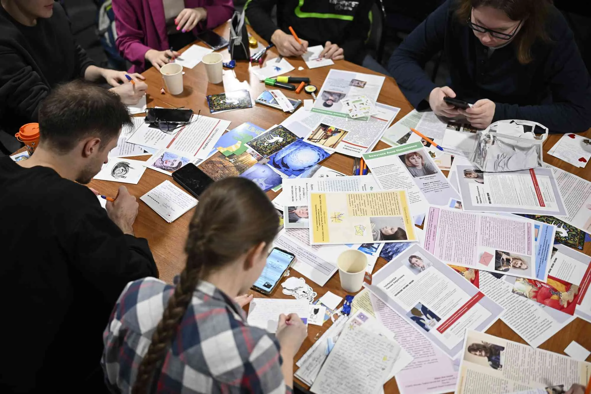 Muscovites write letters to political prisoners in the office of the liberal party Yabloko in Moscow, Russia, Thursday, February 29, 2024. Yabloko hosts monthly letter-writing evenings across the country. With protests all but stifled, more and more Russians at home and abroad are seeking to help political prisoners by writing them letters. (Photo by Dmitry Serebryakov/AP Photo)