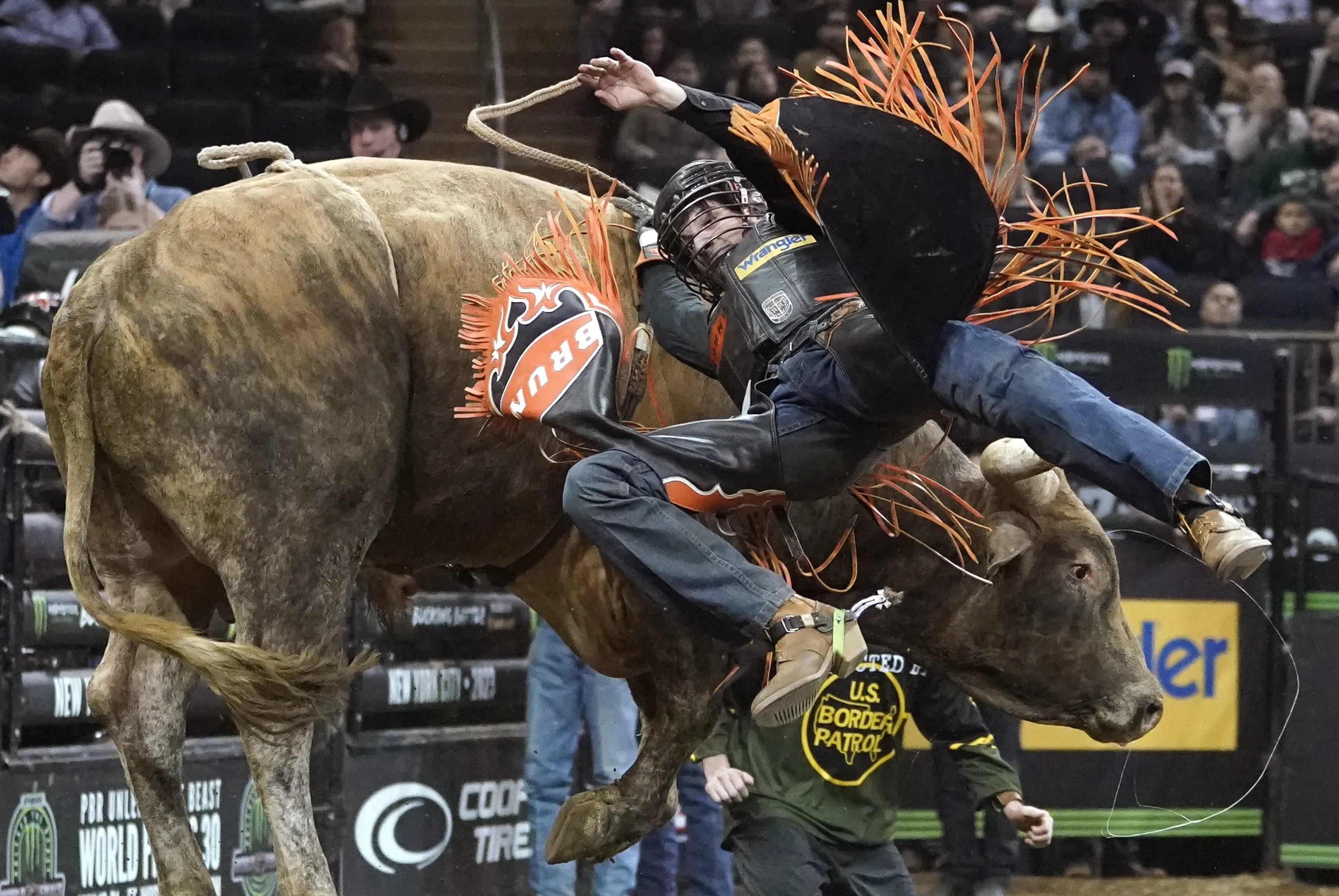 Casey Roberts of the US riding “Dan’s Post Night Moves” during Round 3 of the 2023 PBR Unleash the Beast Monster Energy Buck Off at the Madison Square Garden January 8, 2023. (Photo by Timothy A. Clary/AFP Phoot)