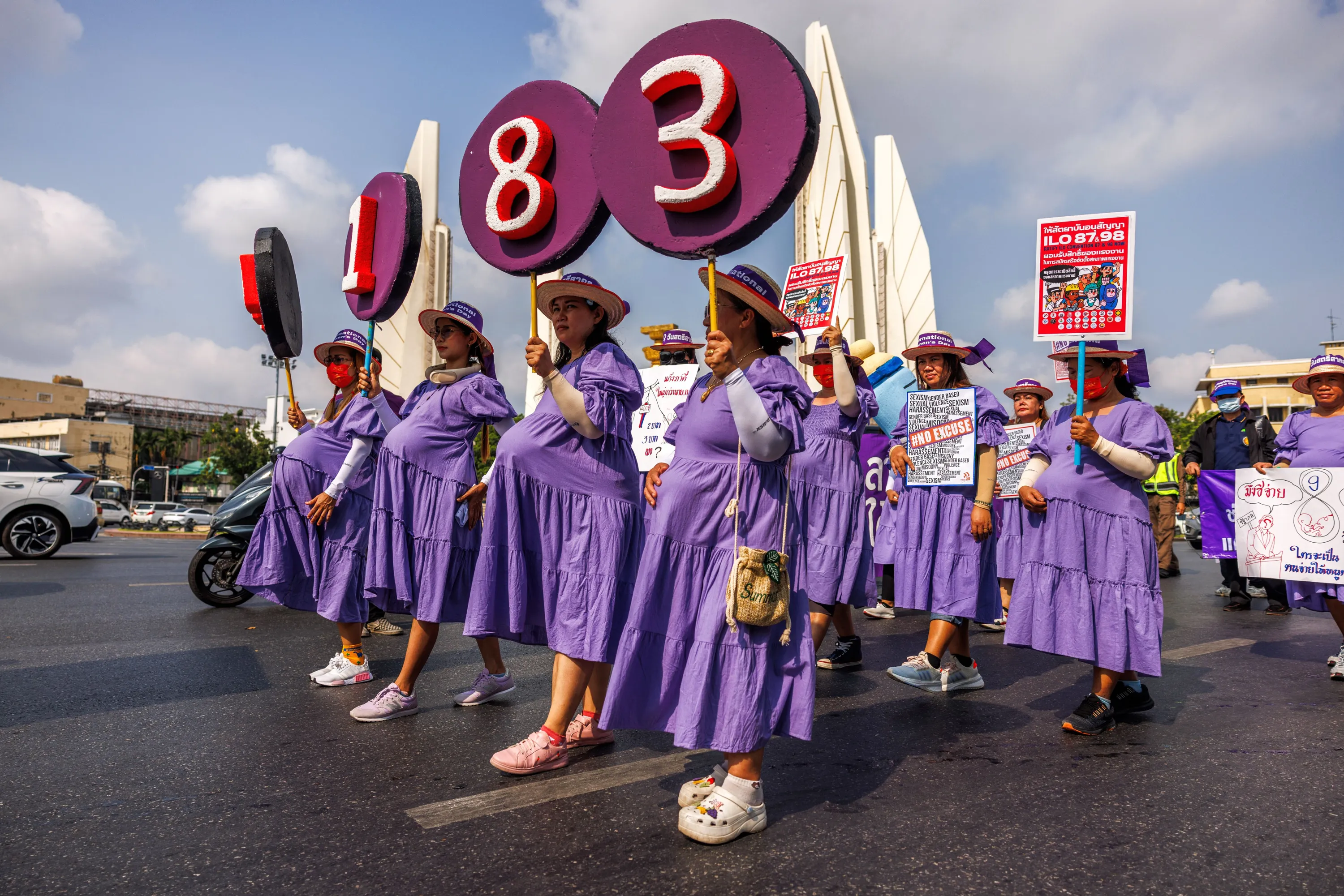 Women dressed in pregnancy costumes march to Government House on International Women's Day to draw attention to maternity issues on March 08, 2024 in Bangkok, Thailand. Members of Thai labor unions and women's networks march from Democracy Monument to Government House calling for women workers rights and maternity rights on International Women's Day. The demonstration aimed to highlight the duration of maternity leave for women in Thailand, currently set at only 8 days. Women's groups are calling upon the government to extend maternity leave to 120 days. (Photo by Lauren DeCicca/Getty Images)