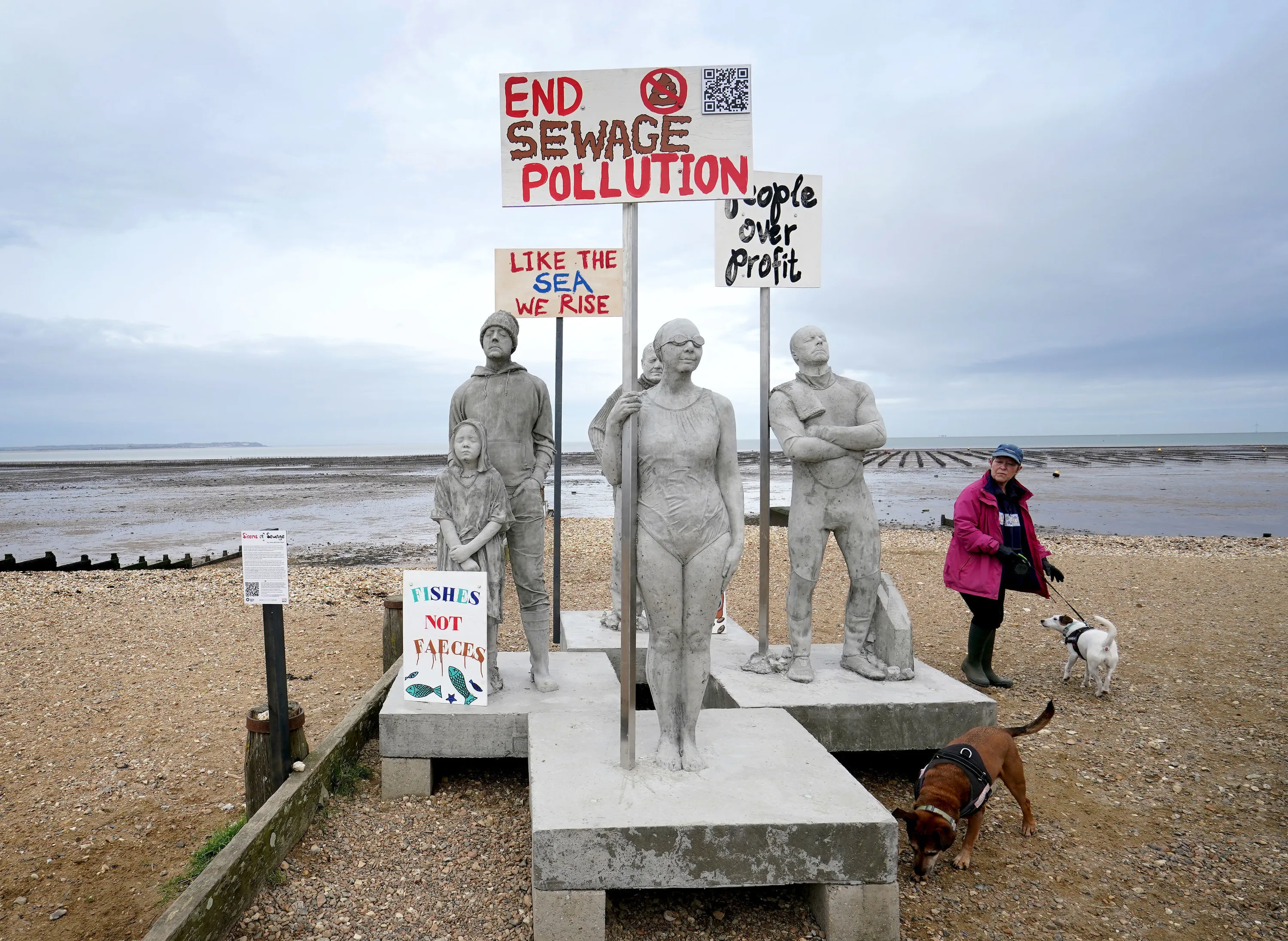 A view of art installation, Sirens of Sewage, by Jason DeCaires Taylor unveiled on the beach in Whitstable, Kent on Tuesday. February 13, 2024, portraying a small cross-section of the local Whitstable community, a cold water swimmer, a school child, kite surfer, a lifeboat volunteer and a local fisherman. The art installation is intended to celebrate these people who are part of a national network of volunteers, driving public discourse and political action to safeguard the health of our water bodies and marine ecologies. (Photo by Gareth Fuller/PA Images via Getty Images)