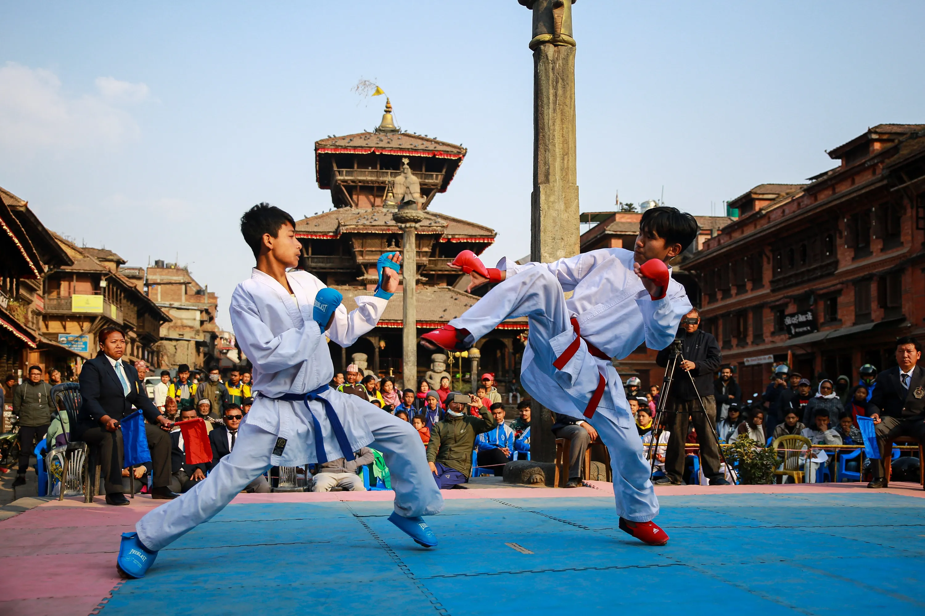 Students from various schools are participating in the Bhaktapur Municipal School-level Karate Competition, organized by the Bhaktapur Municipality in Bhaktapur, on February 9, 2024. (Photo by Amit Machamasi/NurPhoto/Rex Features/Shutterstock)
