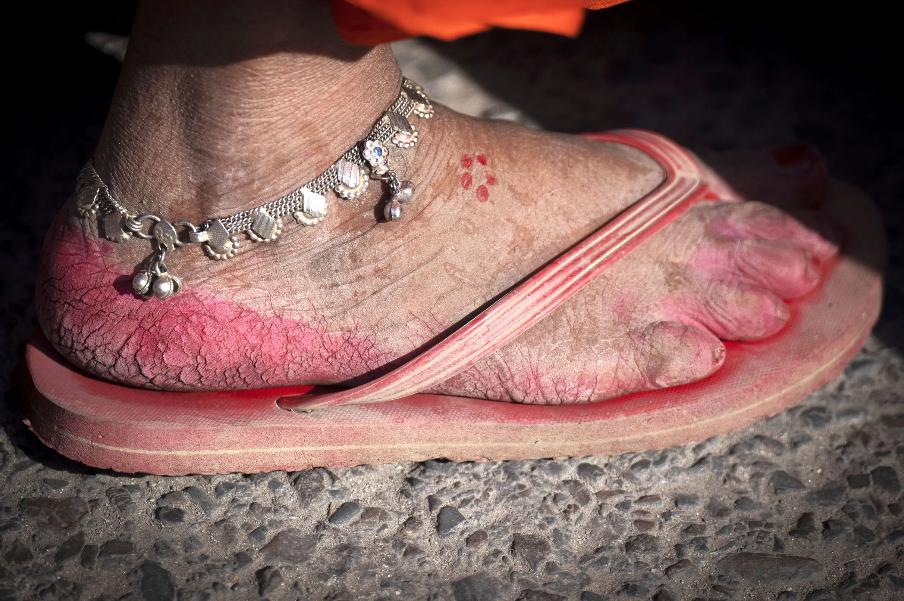 The feet of a protestor is seen as borrowers, mostly farmers from Nepal’s rural districts, protesting against the alleged excesses of private lenders gather in Kathmandu, Nepal, Friday, February 23, 2024. Hundreds of protestors from remote villages had walked for weeks to arrive in the capital to demand that the government enact laws to regulate the lenders. (Photo by Niranjan Shrestha/AP Photo)