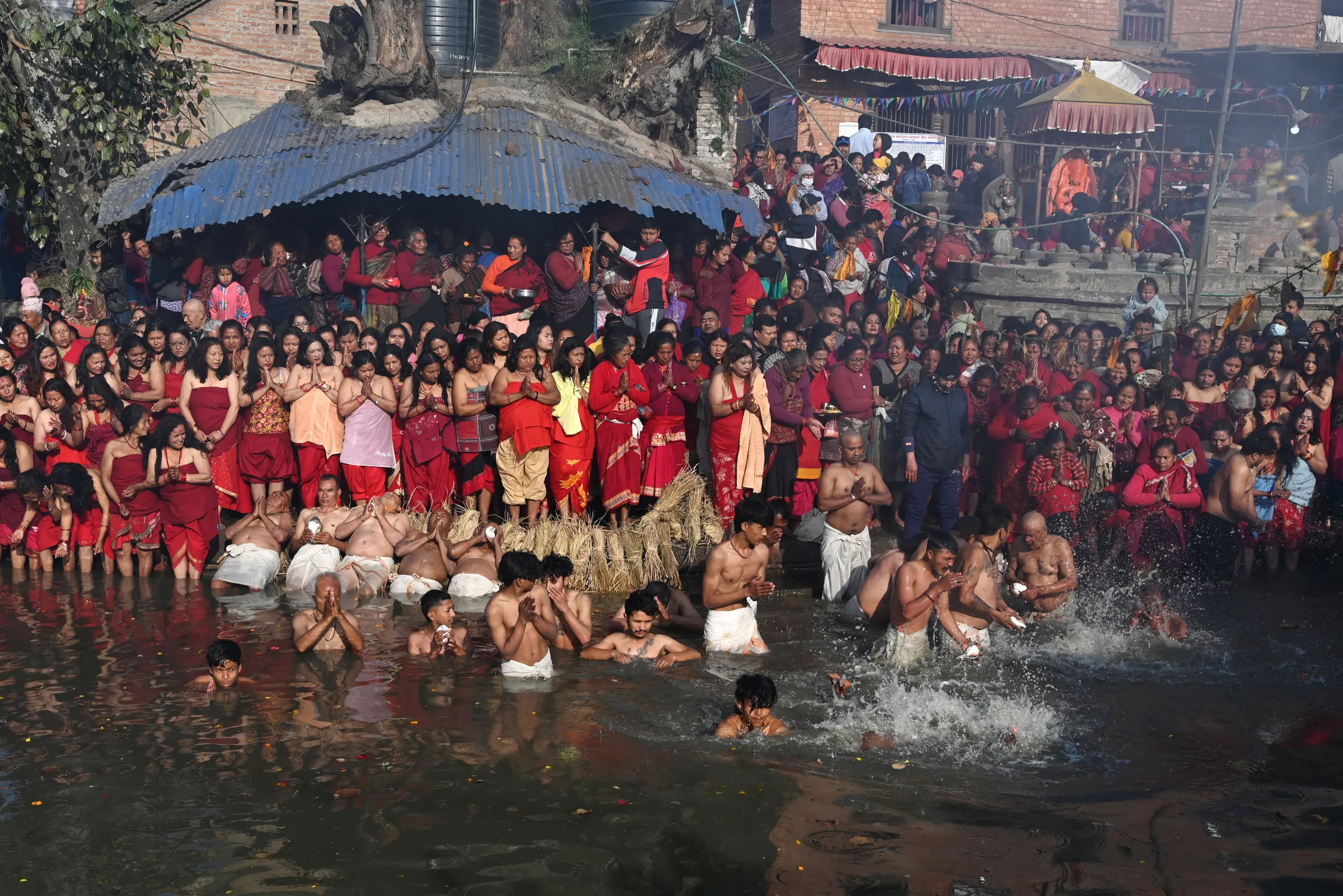 Hindu devotees take part in a bathing ritual on the last day of the month-long 'Madhav Narayan' Hindu festival along the Hanumante River in Bhaktapur on the outskirts of Kathmandu on February 24, 2024. (Photo by Prakash Mathema/AFP Photo)