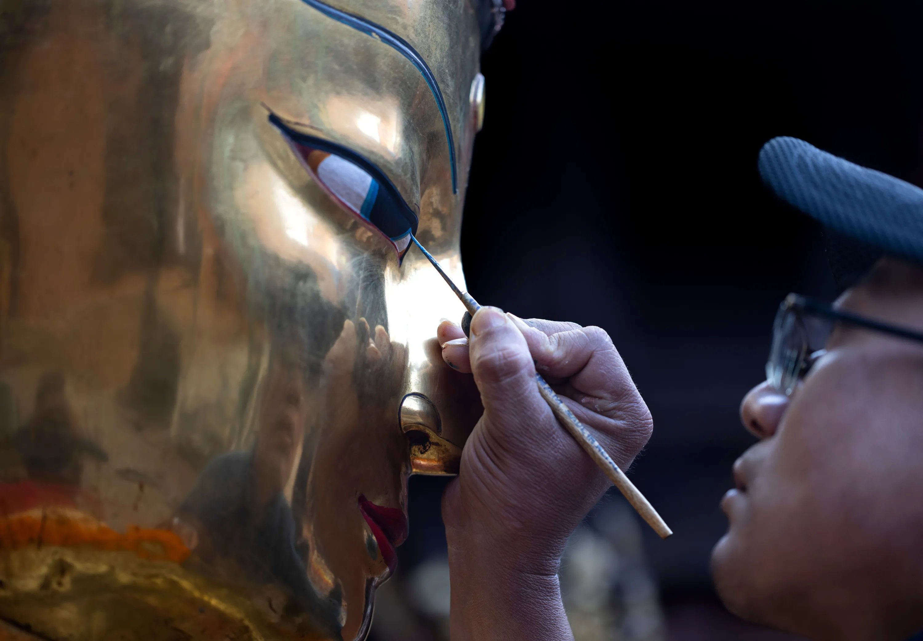 A Nepalese man paints the eye of Lord Buddha before the procession of the Samyak Mahadan festival in Patan, Nepal, 13 March 2024. Thousands of devotees observed the two-day-long Samyak Mahadan, an alms-giving festival offering worship at the painted idol of Lord Buddha, brought from various temples, for world peace and human welfare. Devotees offer different gifts to the deities, monks, and Buddhist communities, including money, food, and rice, during this festival, which is observed every five years. (Photo by Narendra Shrestha/EPA/EFE)