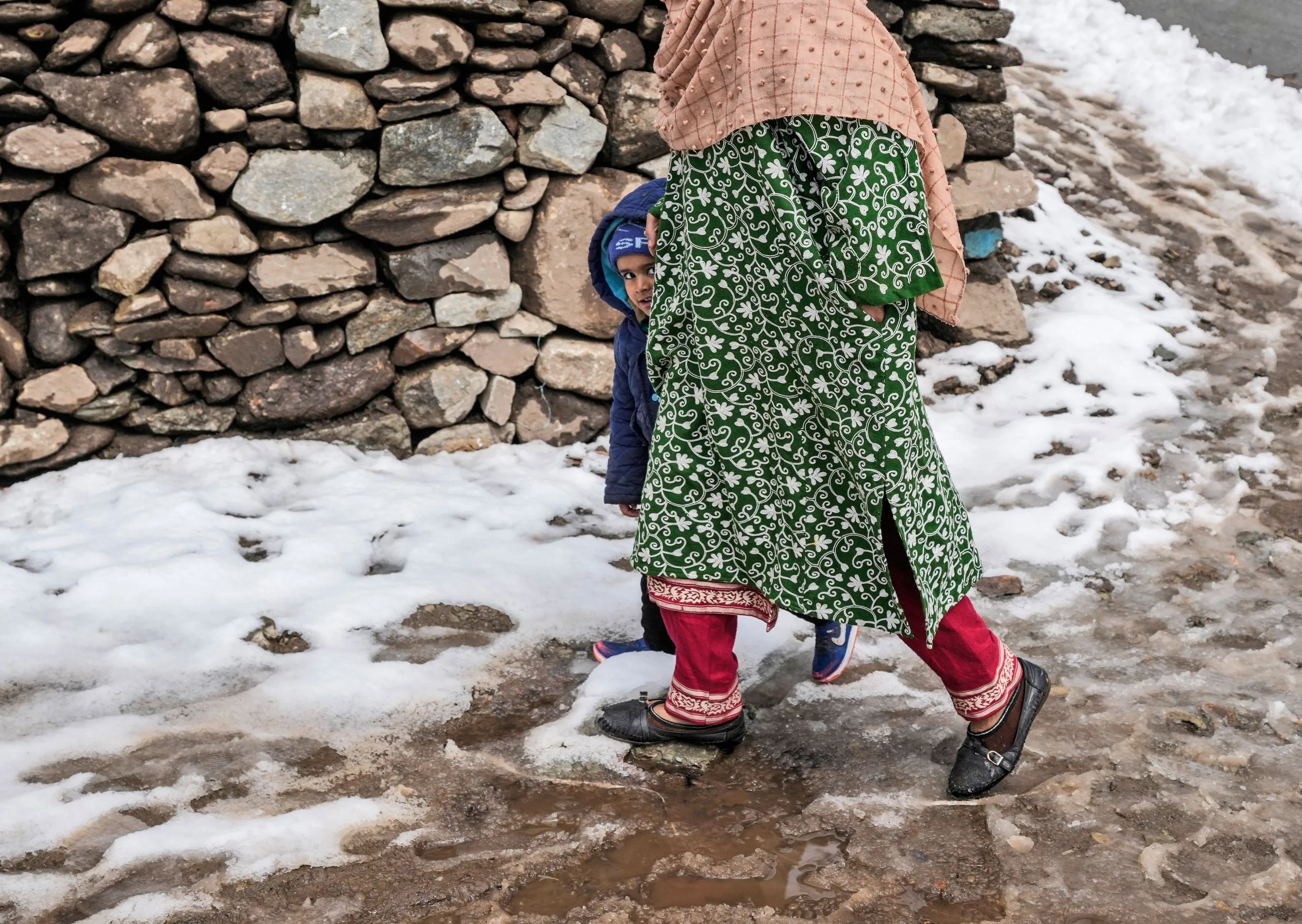 A woman walks with a child on a snow covered road to get him polio drops at a government health centre in Srinagar, Indian controlled Kashmir, Sunday, March 3, 2024. India eradicated polio more than a decade ago after successfully implementing a polio immunization programme adopted in 1995. (Photo by Mukhtar Khan/AP Photo)