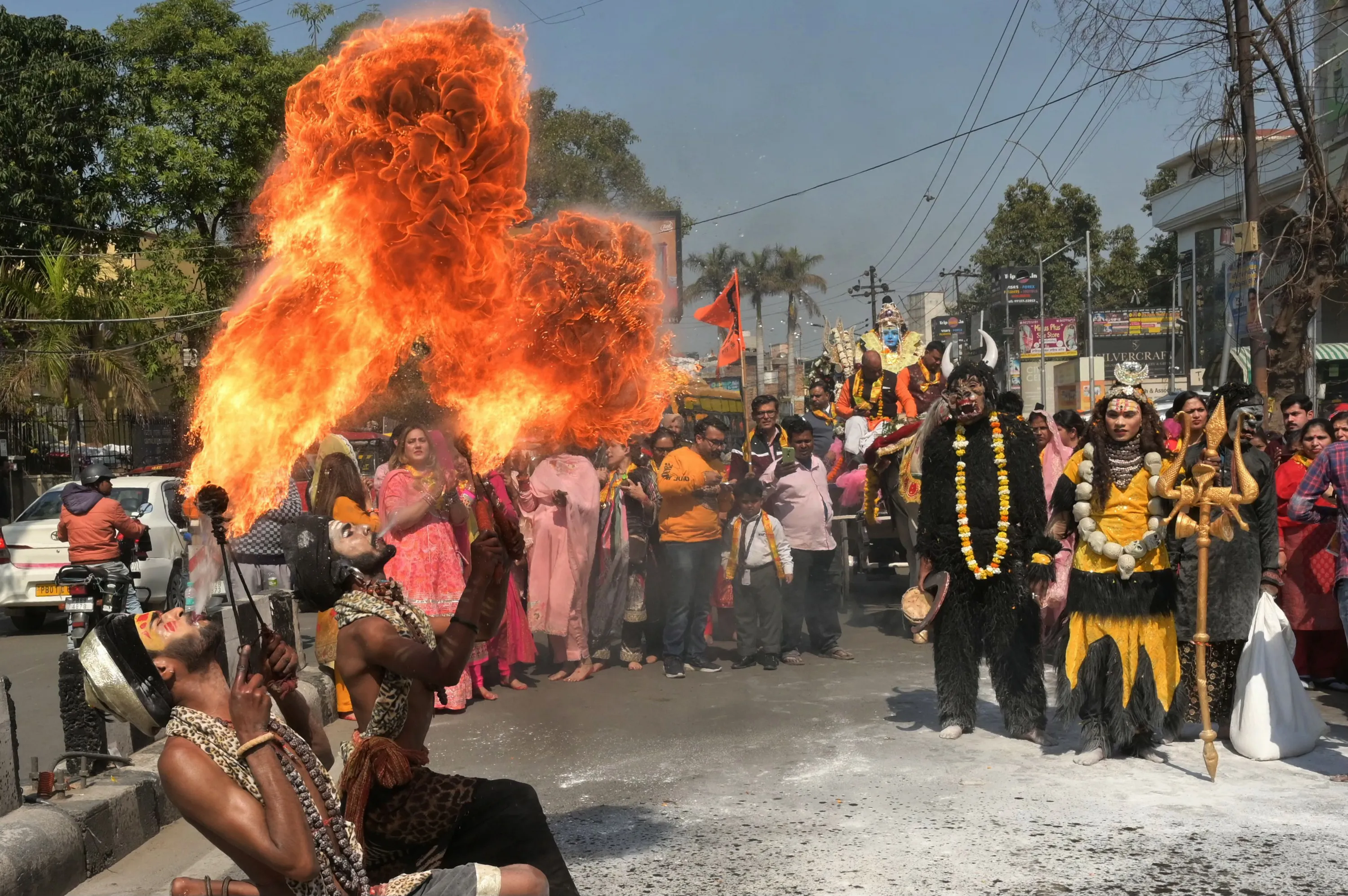 Dancers perform a fire breathing act during a Hindu religious procession ahead of the “Maha Shivaratr”', an annual festival dedicated to the Hindu God Shiva, in Amritsar on March 6, 2024. (Photo by Narinder Nanu/AFP Photo)