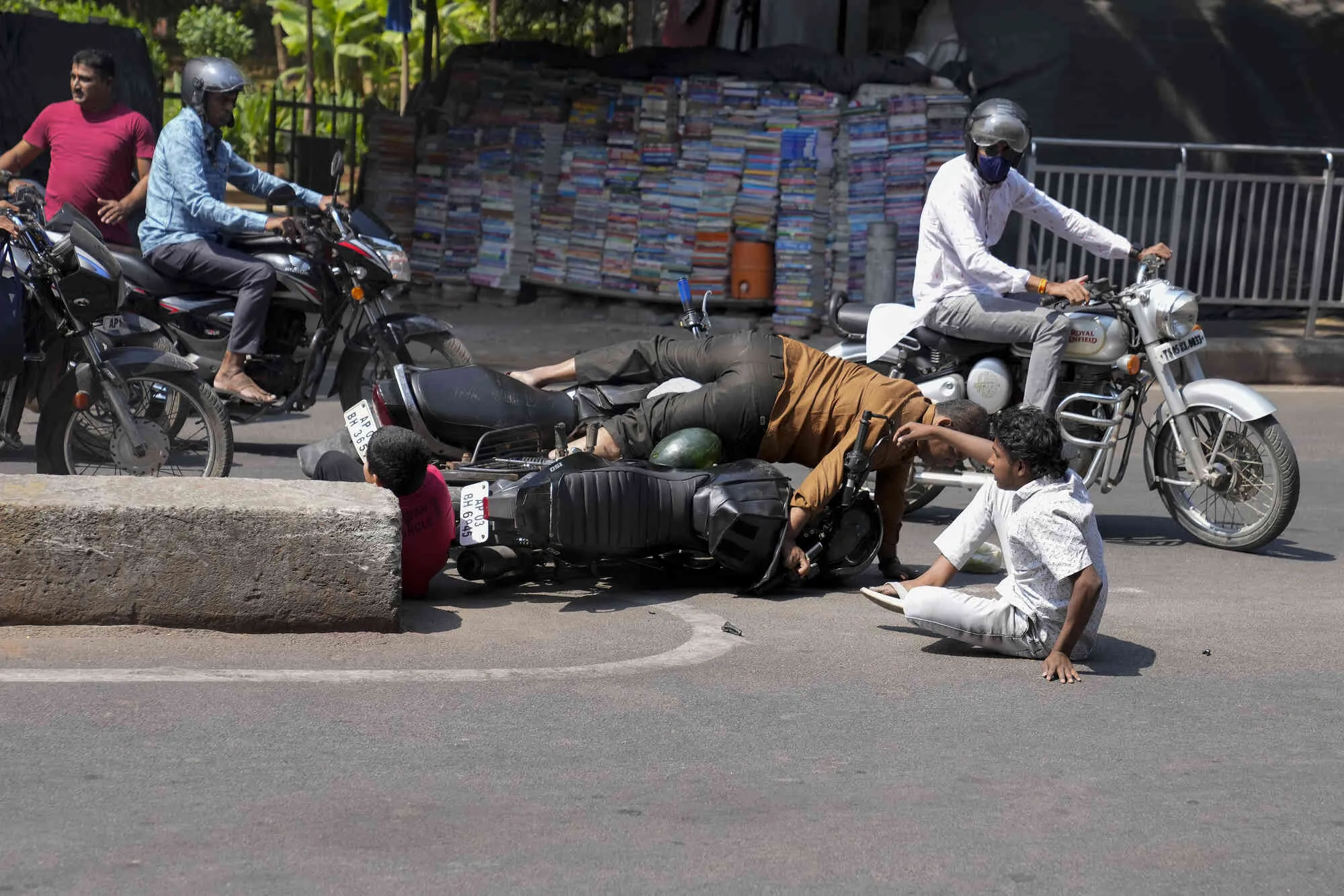 Riders and a pillion rider fall on the ground after two speeding motorcycles collided at a busy road in Hyderabad, India, Friday, March 8, 2024. No major injuries were reported in the accident. (Photo by Mahesh Kumar A./AP Photo)