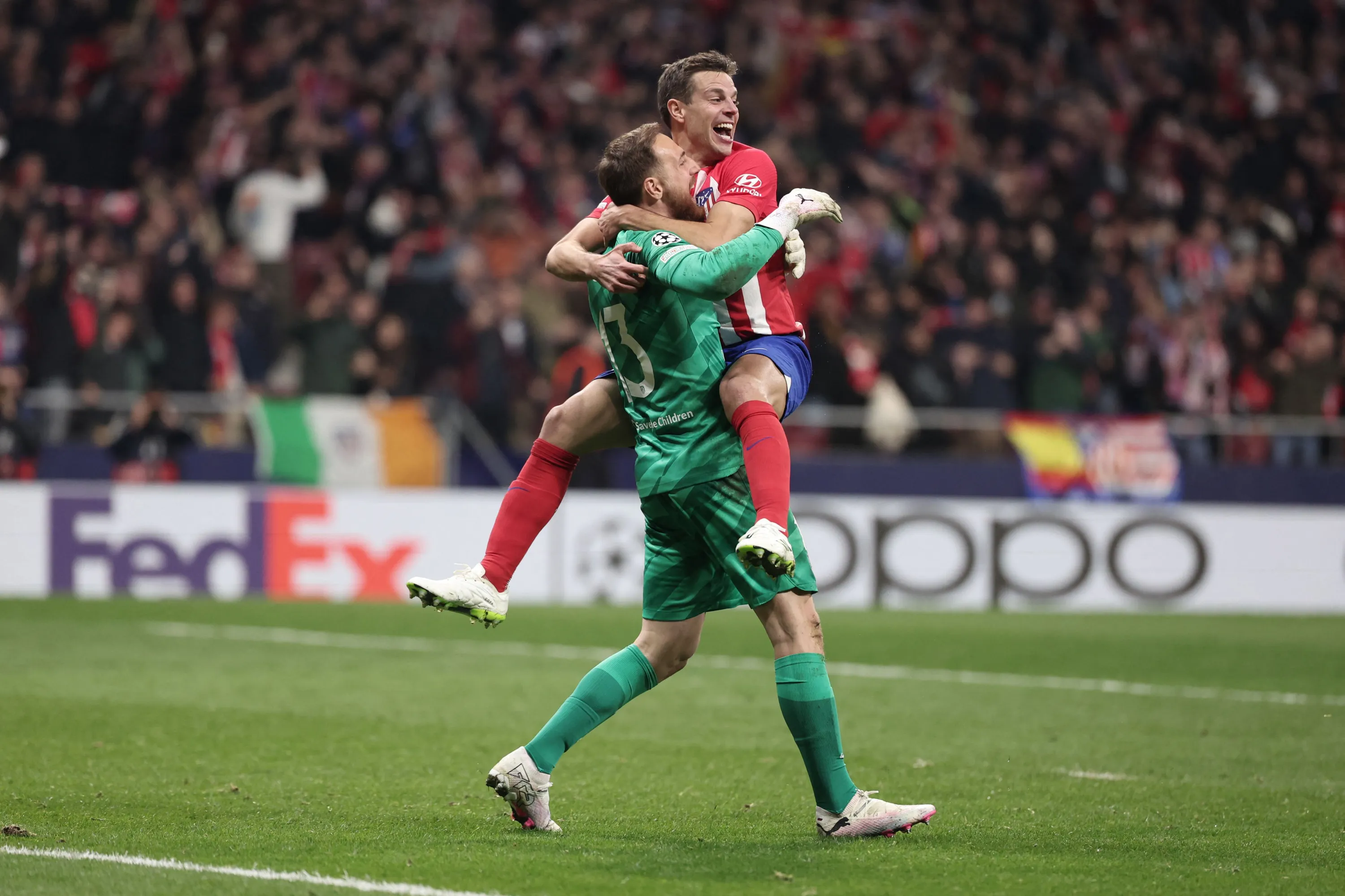 Atletico Madrid's Slovenian goalkeeper #13 Jan Oblak and Atletico Madrid's Spanish defender #03 Cesar Azpilicueta celebrate victory at the end of the UEFA Champions League last 16 second leg football match between Club Atletico de Madrid and Inter Milan at the Metropolitano stadium in Madrid on March 13, 2024. (Photo by Thomas Coex/AFP Photo)