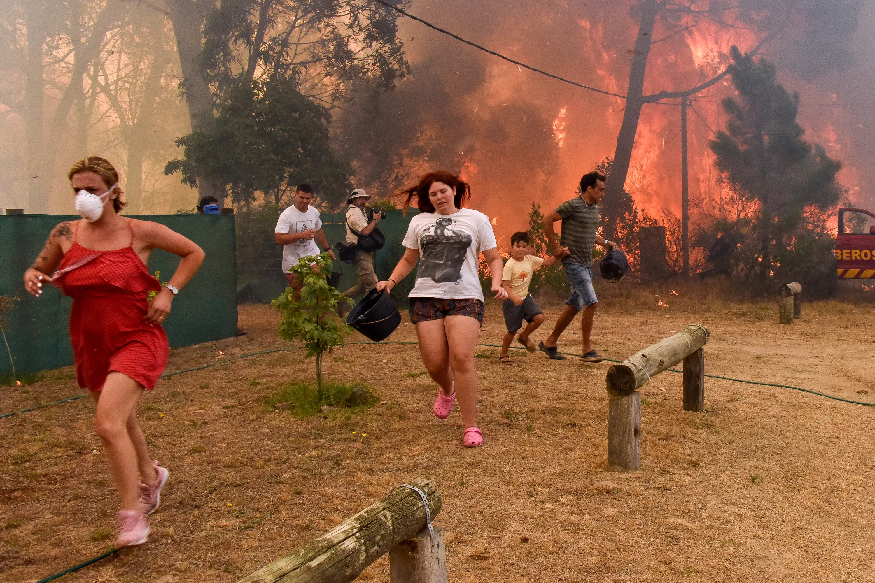 People run from flames during fire in La Floresta, Uruguay, 26 January 2023. The fire grew due to intense winds amid drought conditions and has resulted in several casualties. (Photo by Federico Gutierrez/EPA/EFE)