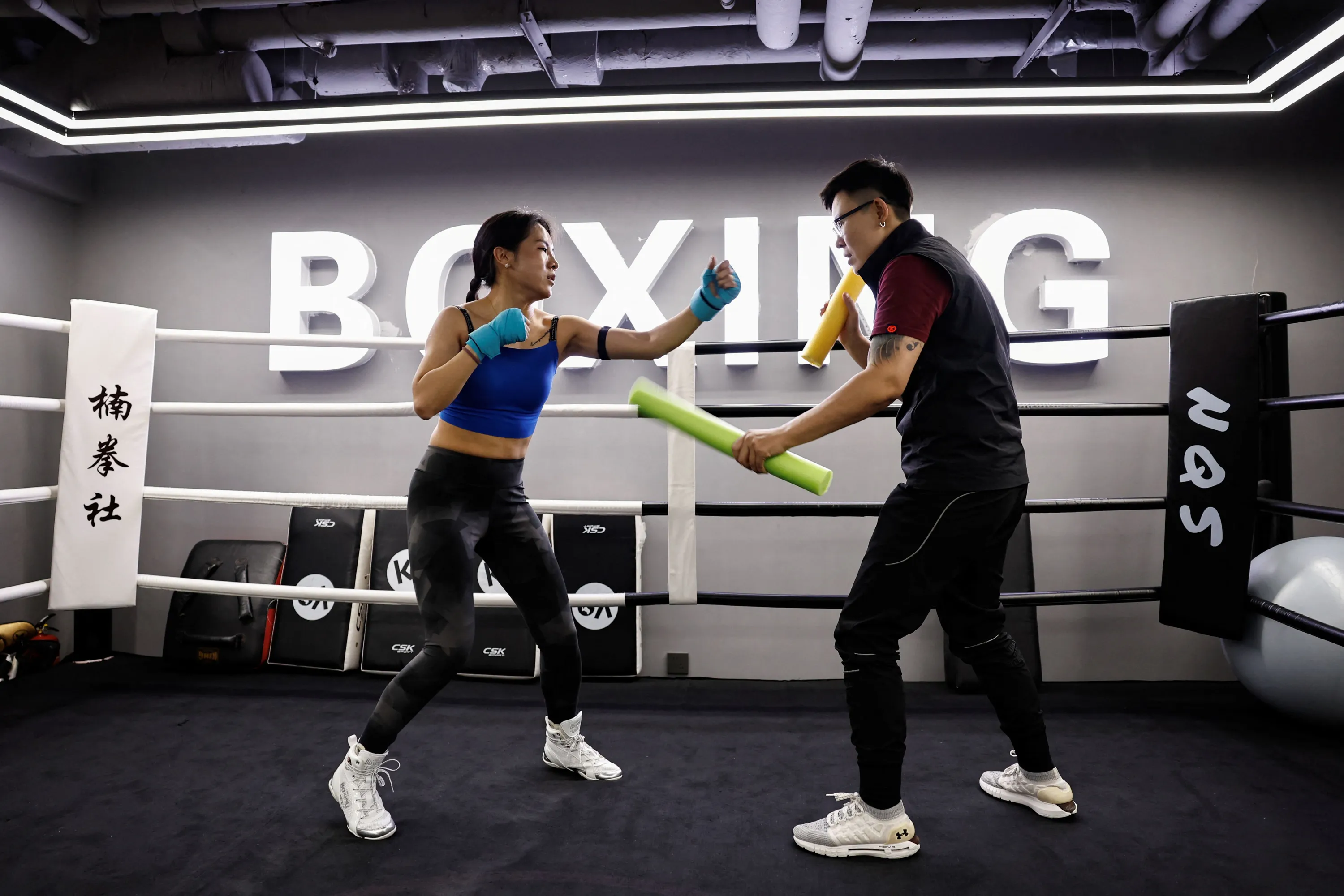 Gym owner Xie Lili (R) coaches a female member during a fitness boxing session at the Nan Boxing Gym in Beijing, China on February 28, 2024. (Photo by Tingshu Wang/Reuters)