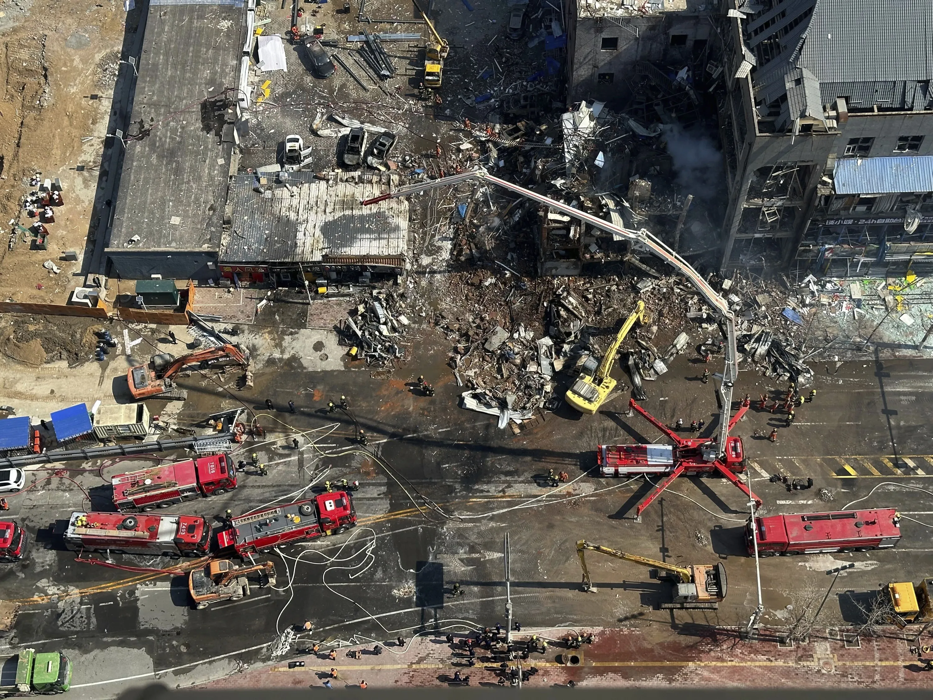 Firefighters work the scene of an explosion in Sanhe city in northern China’s Hebei province on Wednesday, March 13, 2024. Rescuers were responding to a suspected gas leak explosion Wednesday in a building in northern China, authorities said. (Photo by Ng Han Guan/AP Photo)