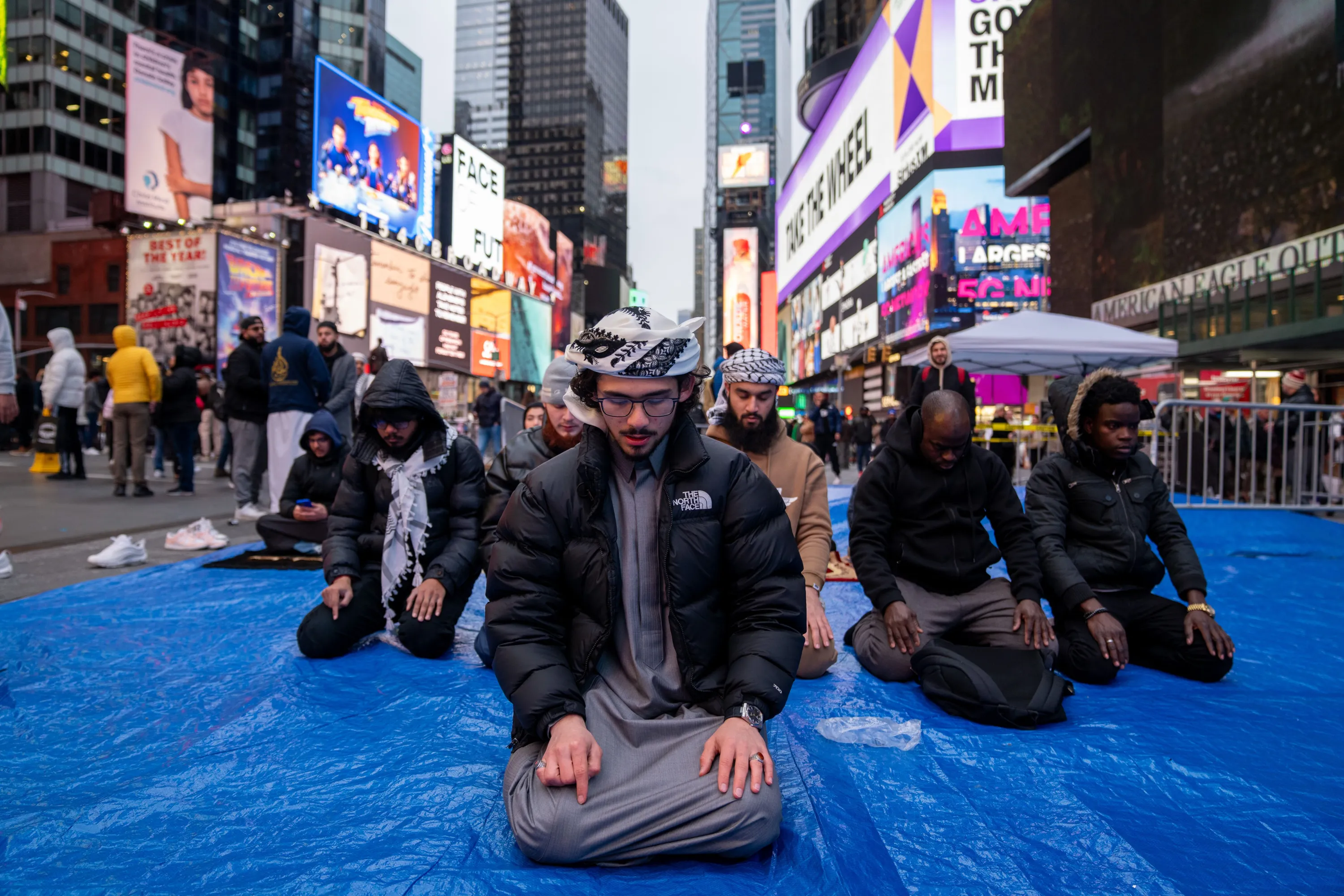 Members of the Muslim community gather at Times Square for the first Tarawih prayer of Ramadan on March 10, 2024 in New York City. Ramadan is observed by Muslims worldwide and is regarded as a commemoration of Muhammad's first revelation. The annual observance of Ramadan is celebrated by fasting until sunset each day (sawm), and prayer (salah). (Photo by David Dee Delgado/Getty Images)
