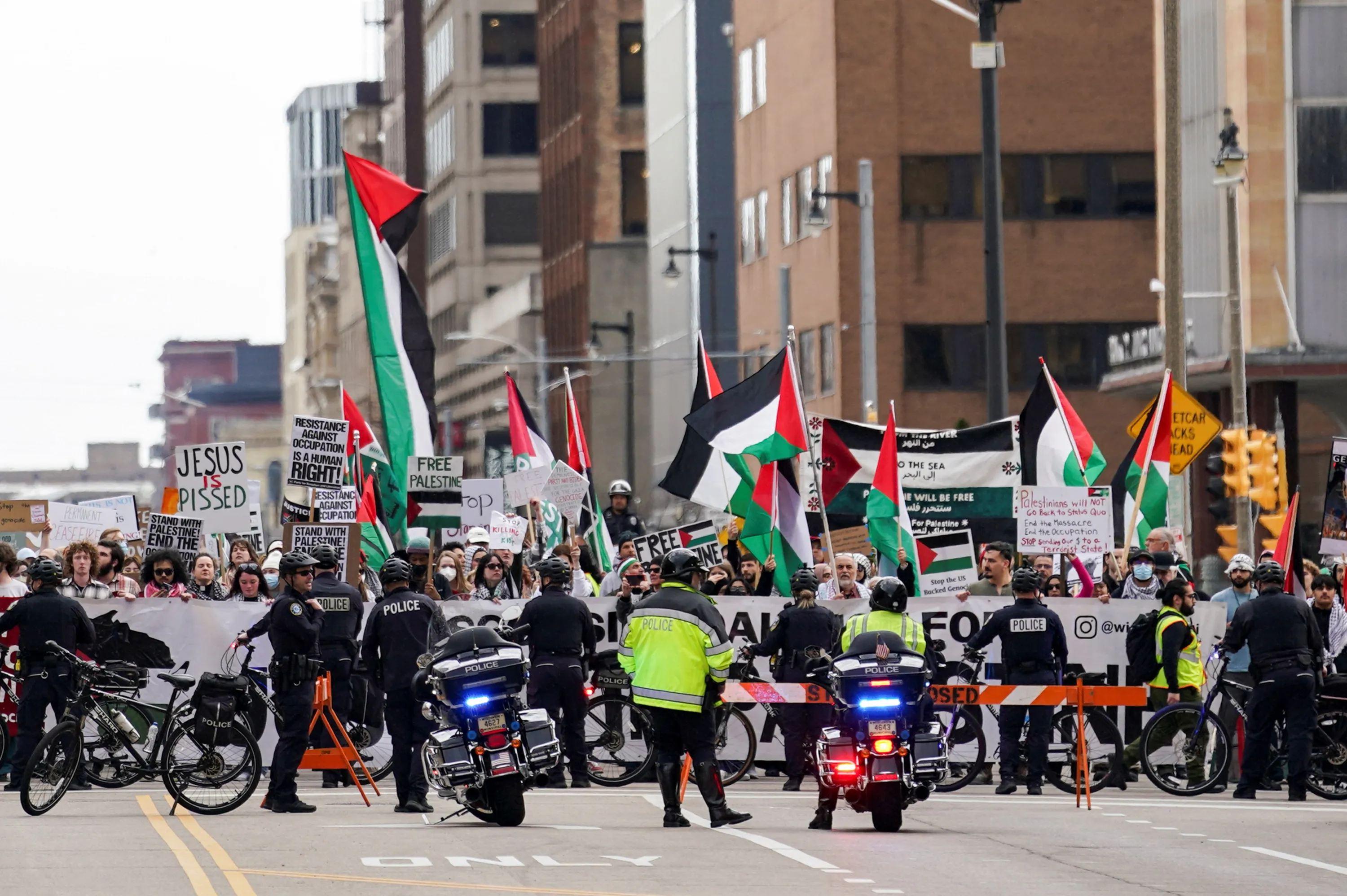 Police keep back demonstrators calling for a ceasefire in Gaza, amid the ongoing conflict between Israel and the Palestinian Islamist group Hamas, near the campaign headquarters of U.S. President Joe Biden for the state of Wisconsin, in Milwaukee on March 13, 2024. (Photo by Kevin Lamarque/Reuters)